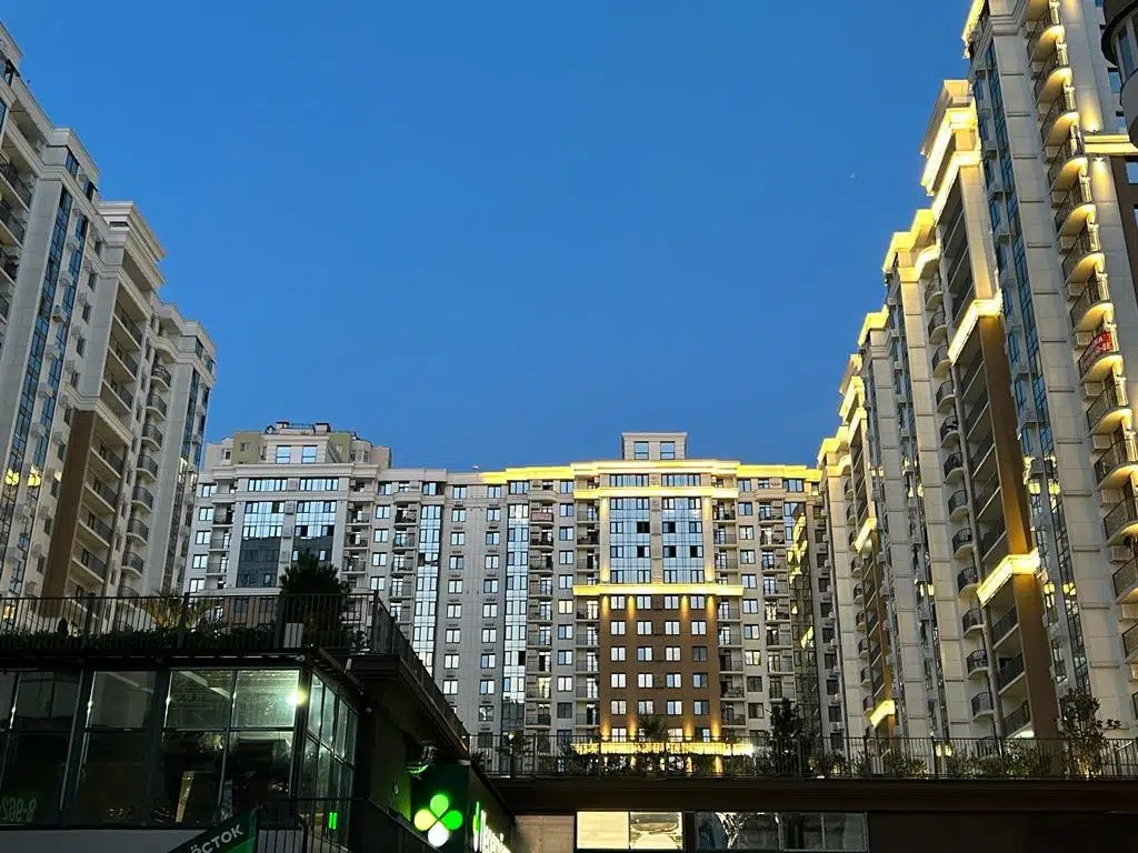 Дом с закрытой территорией, парковкой, большим количеством магазинов включая перекресток, кафе, озон, WB - детская спортивная площадки.
