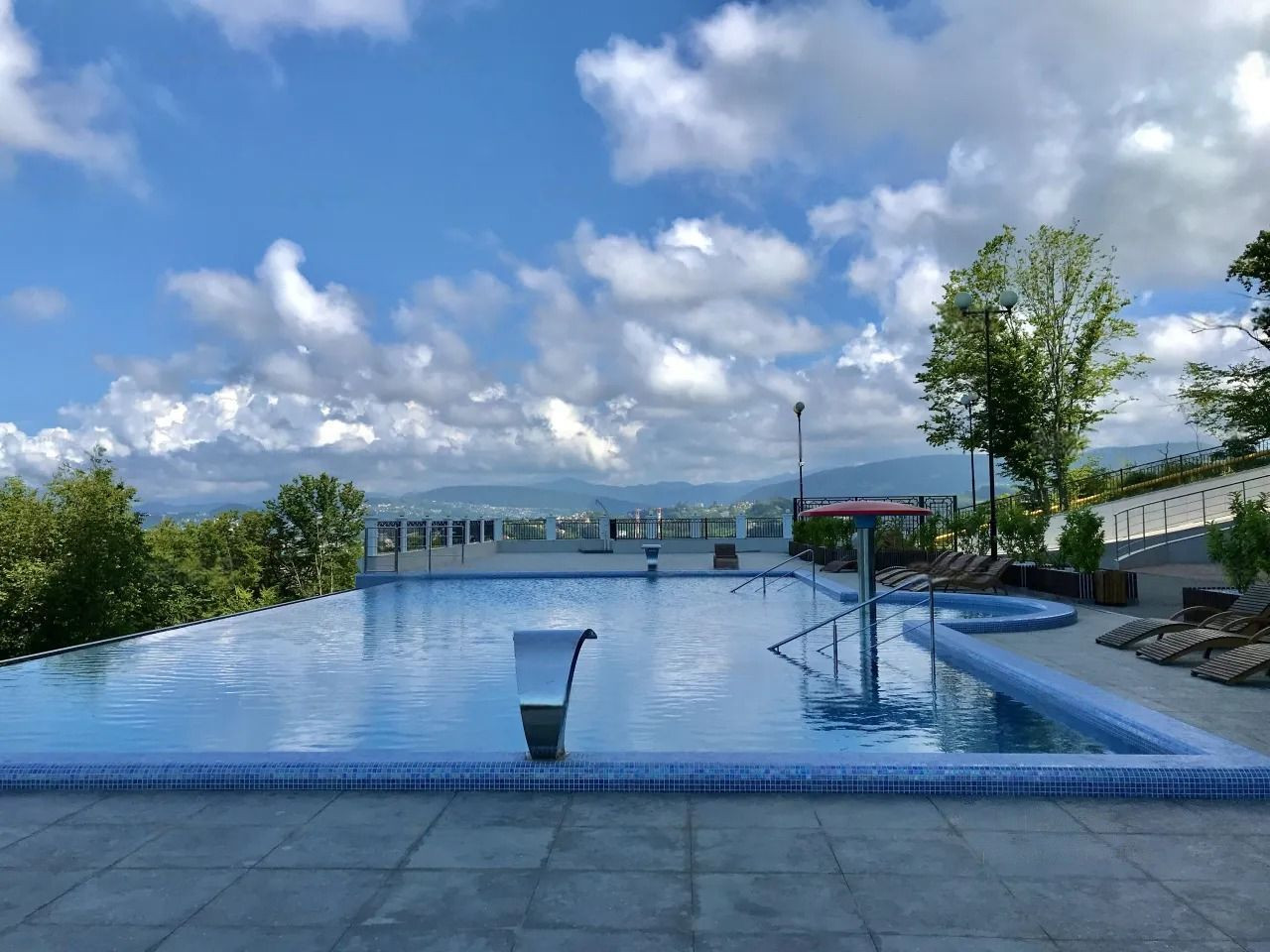 Закрытая территория с зонами отдыха, бассейном, детской площадкой, спортивными площадками и местами для барбекю;