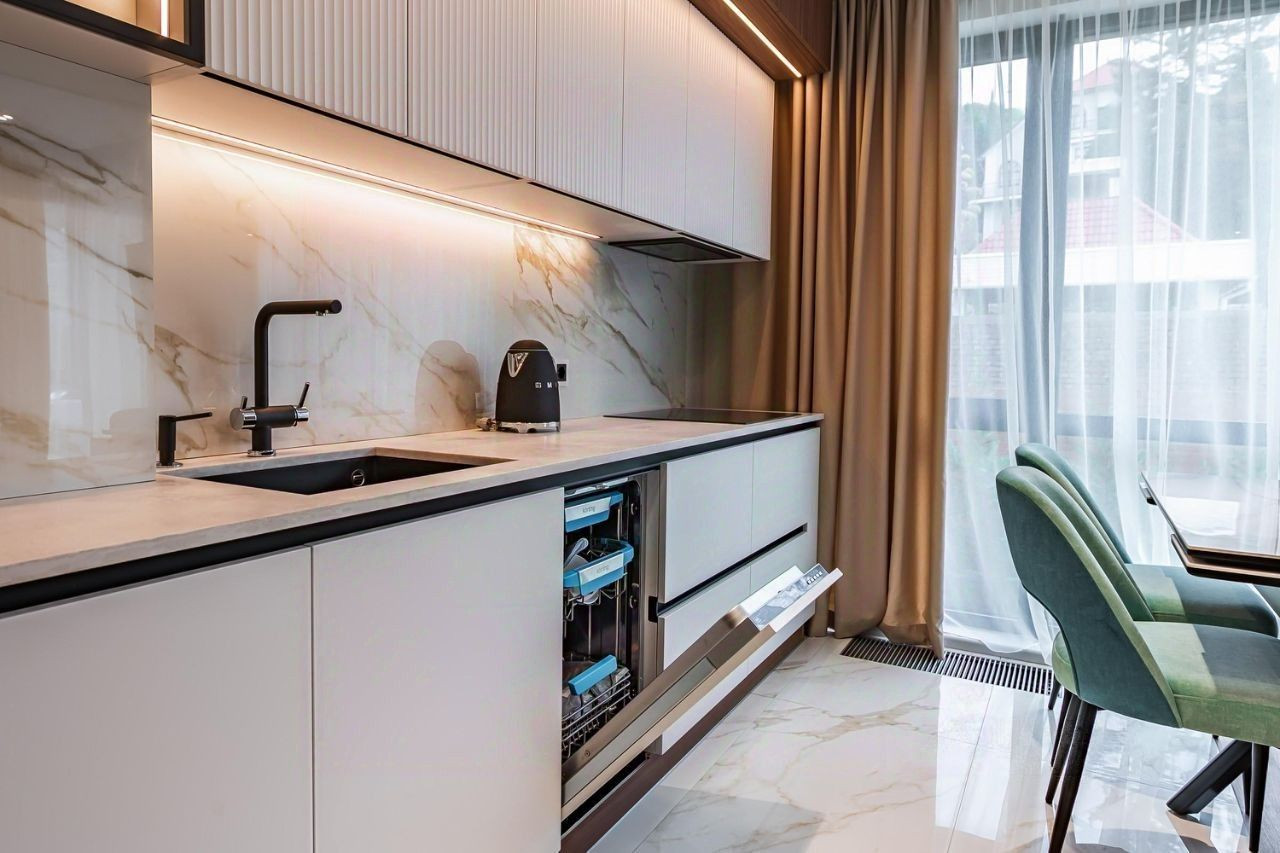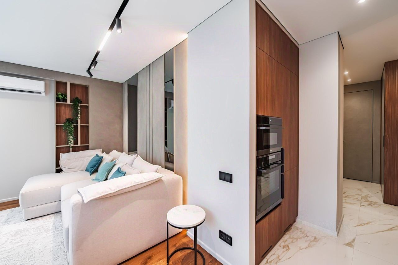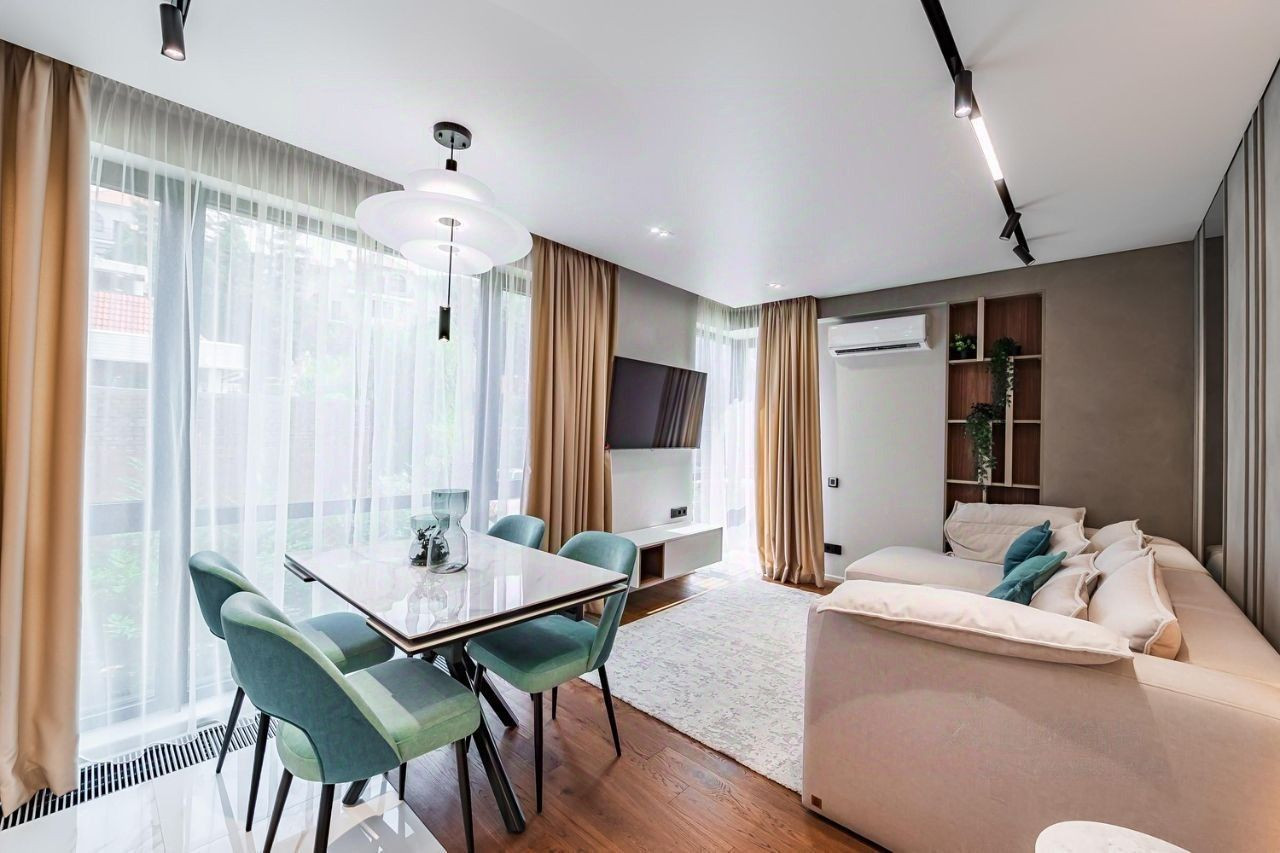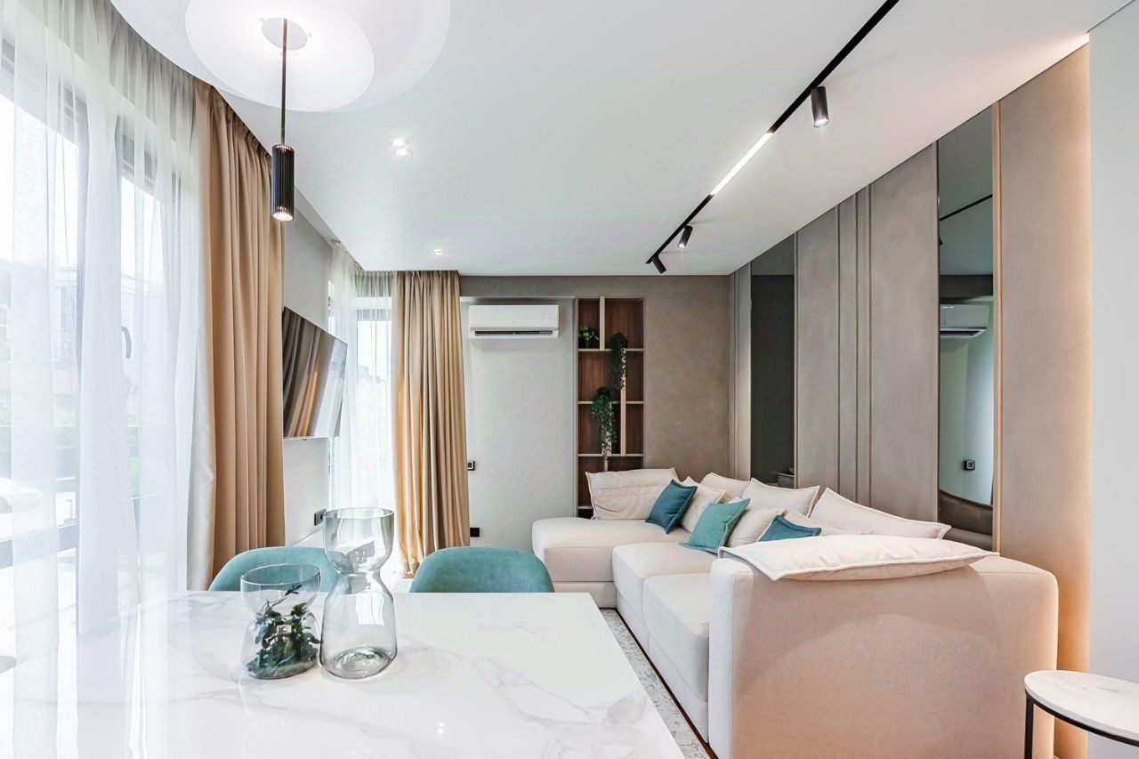 За счет больших панорамных окон, апартаменты всегда наполнены естественным светом. Есть открытый балкон. Очень хороший вид на территорию апартаментного комплекса и морское побережье.