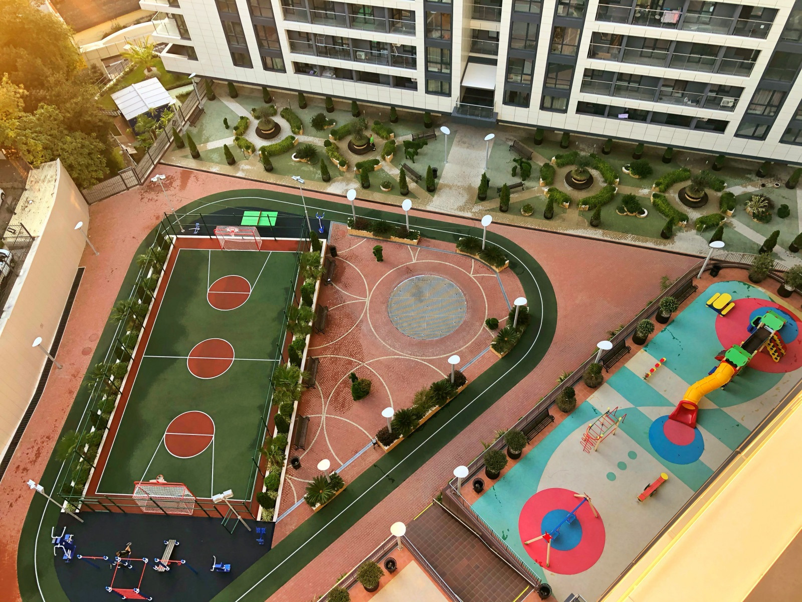 На территории комплекса располагаются детские площадки, спортивная площадка, уличные тренажёры, беговые дорожки, зона отдыха с фонтаном, ландшафтный дизайн.