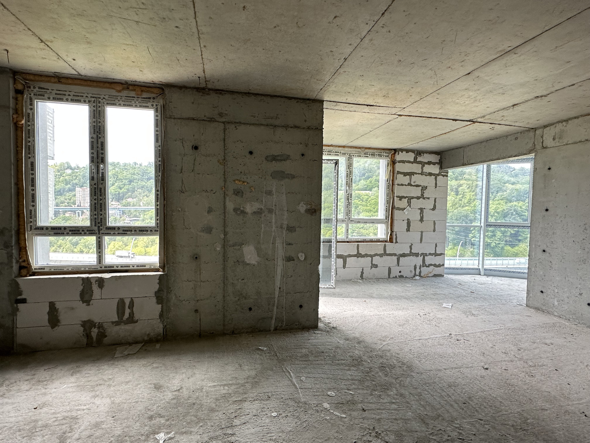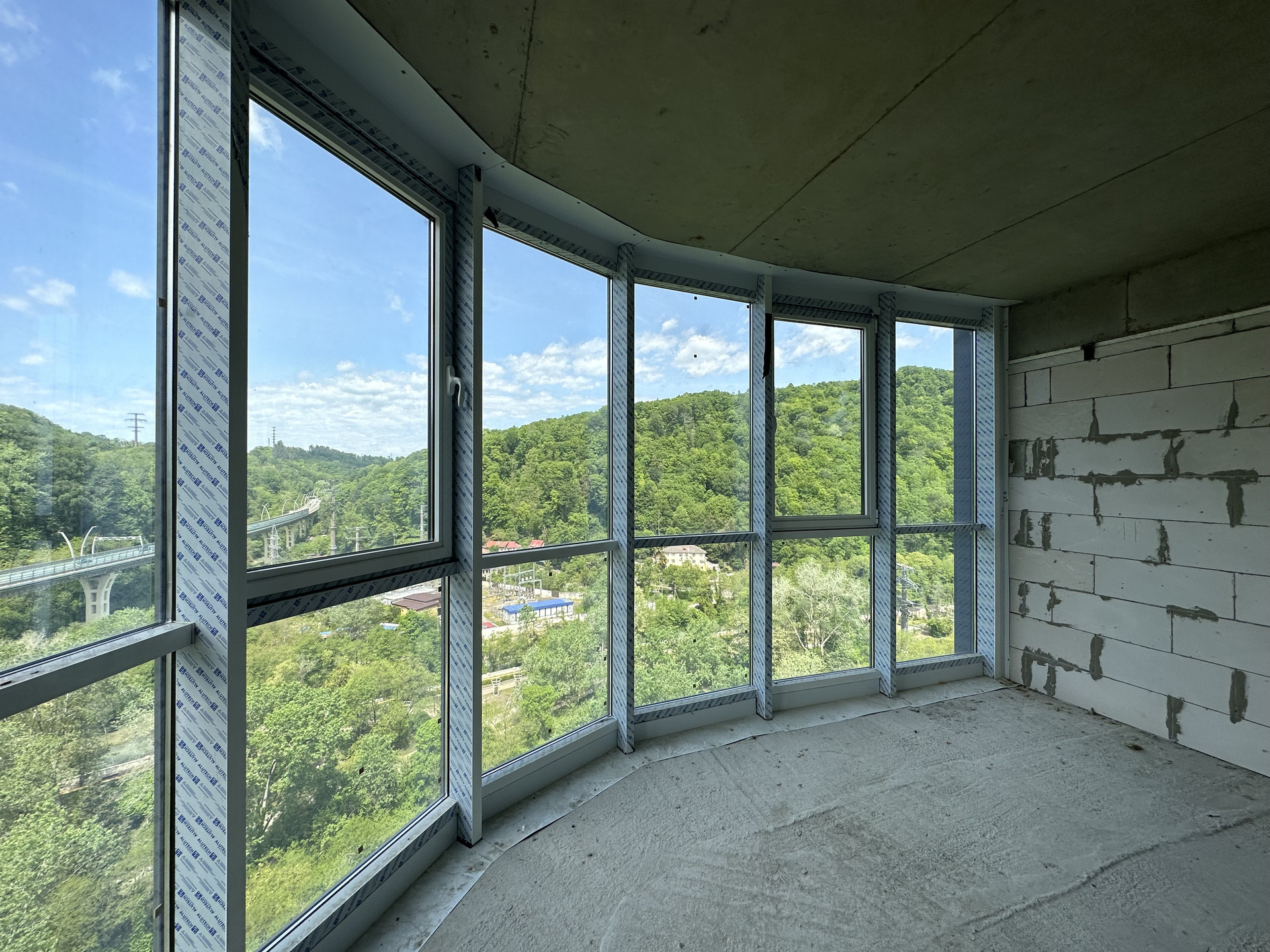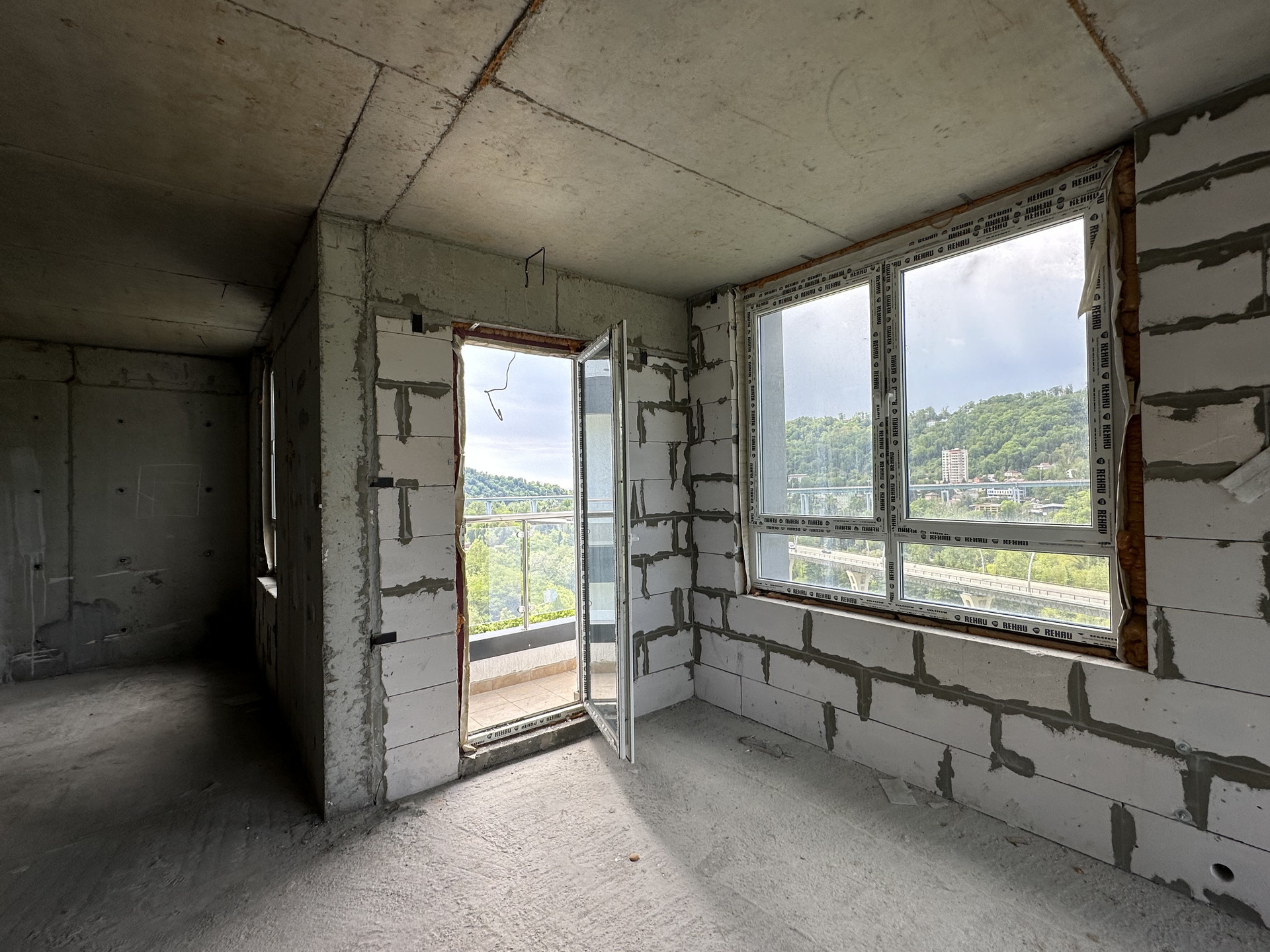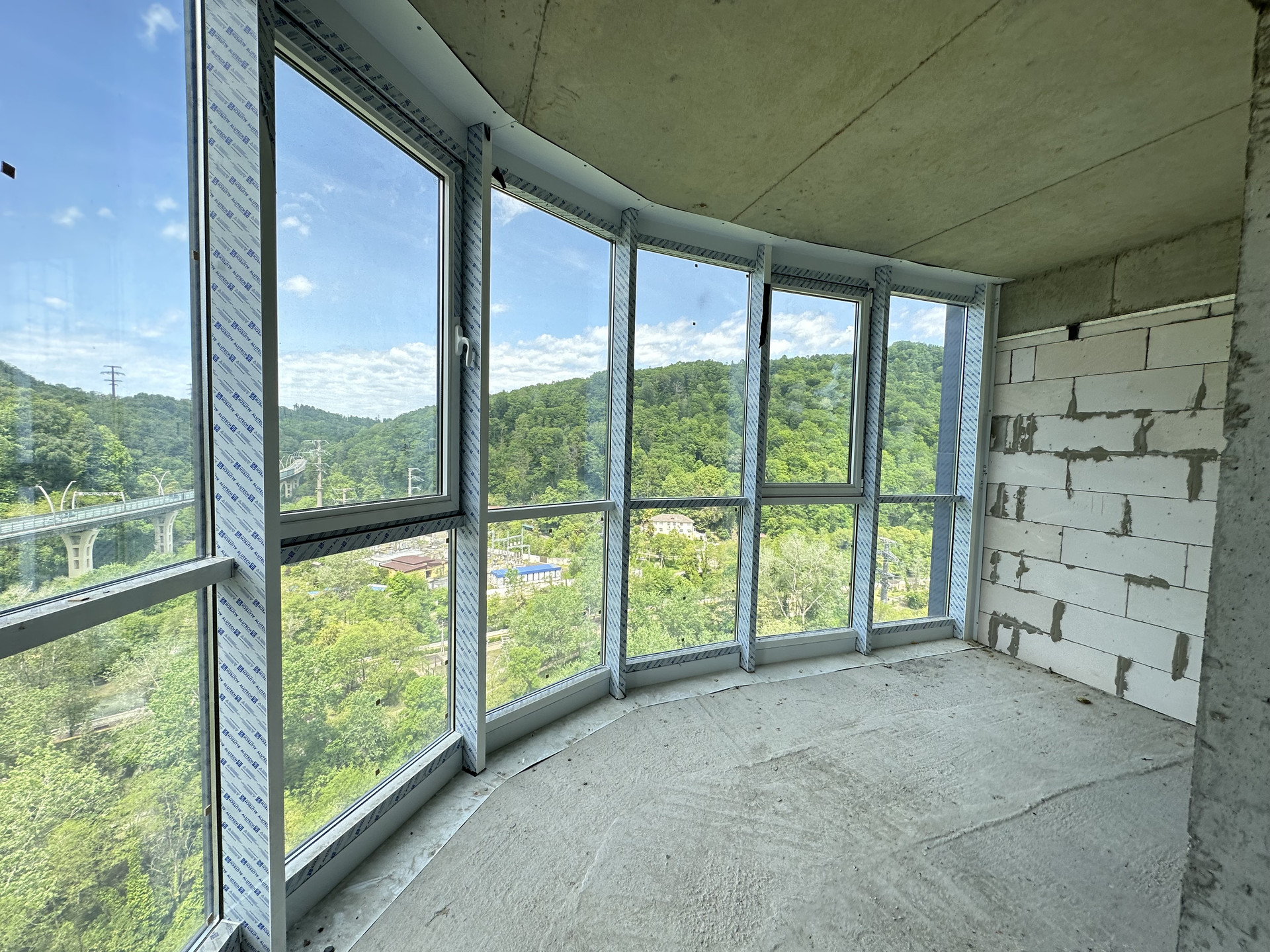 открытый балкон с видом на лес и горы, тихая сторона дома. Ограждения балкона из коленного стекла, не будет мешать видовым характеристикам. Высота потолков в черновом варианте 3 м.
