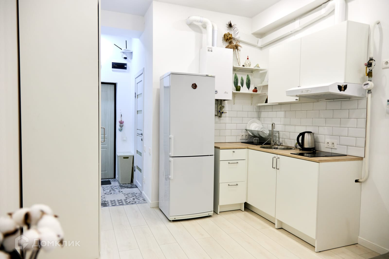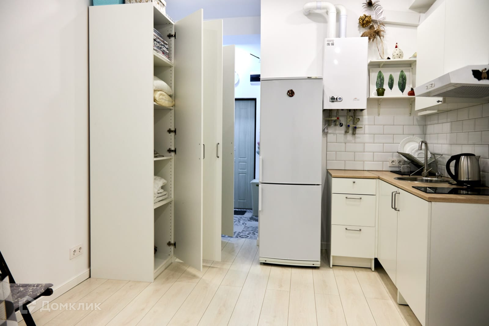 На кухне установлен двухконтурный итальянский газовый котел Ferolli (для отопления и газовой плиты). Фартук выложен плиткой Keramo Marazzi. Кухонный уголок оборудован вместительной раковиной, системой для очистки воды, вытяжкой, встроенной варочной панелью. Большой двухкамерный холодильник Atlant.