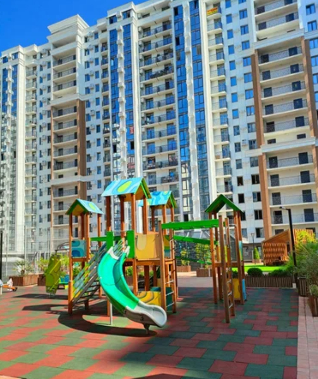 Территория комплекса закрытая. Хорошая парковка, детские и спортивные площадки, круглосуточное наблюдение, консьерж, зоны отдыха внутри.