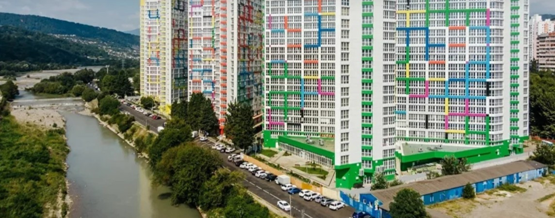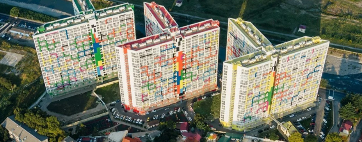 ЖК Раз Два Три расположен в форме буквы Т, благодаря чему из окон открываются живописные виды на горы и море.