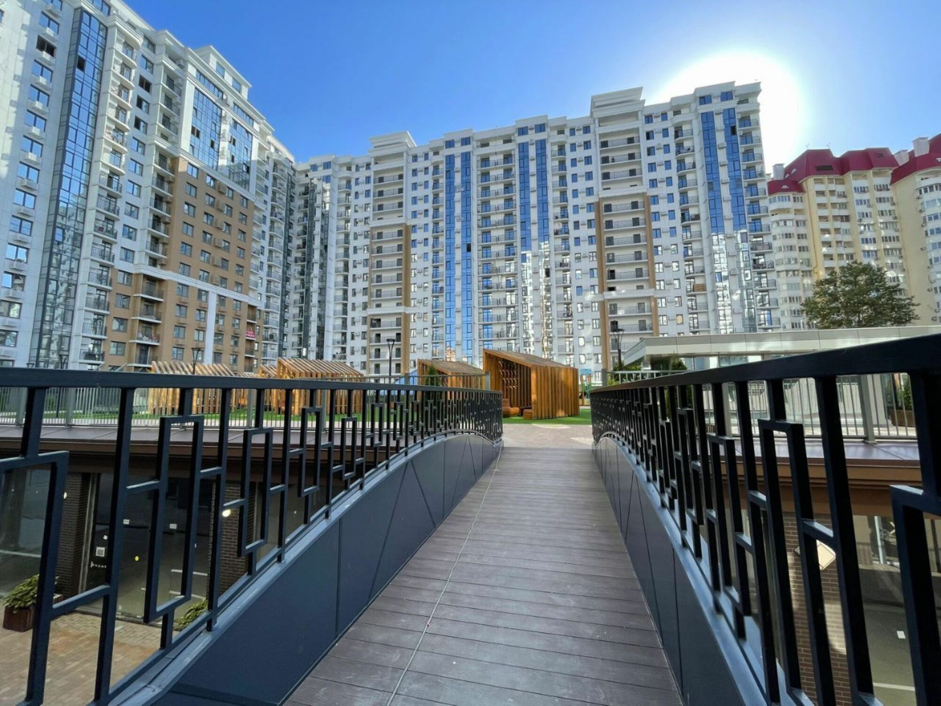 Закрытая территория двора без машин, выход со 2 этажа подъезда - детская площадка, спортивная площадка, зона отдыха с беседками, ландшафтное озеленение.