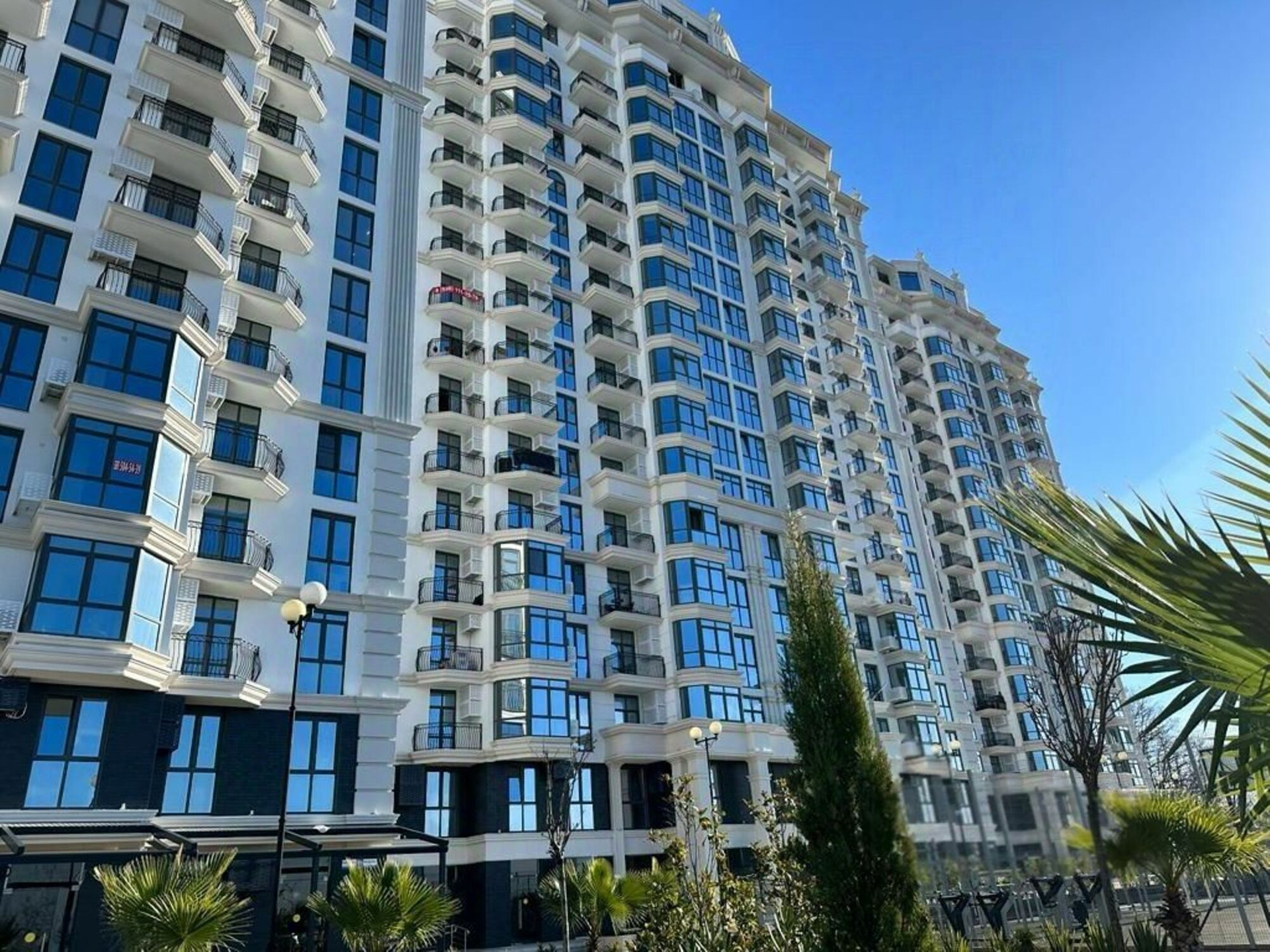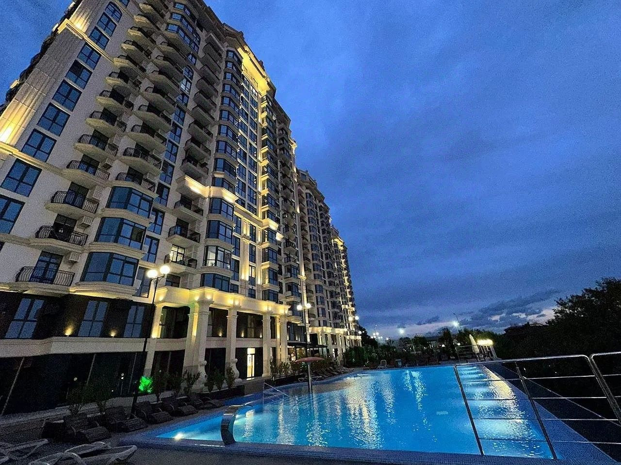 Придомовая территория благоустроена, оборудована детская площадка, бассейн и концепция город в городе со всей необходимой коммерцией для жизни в комплексе.