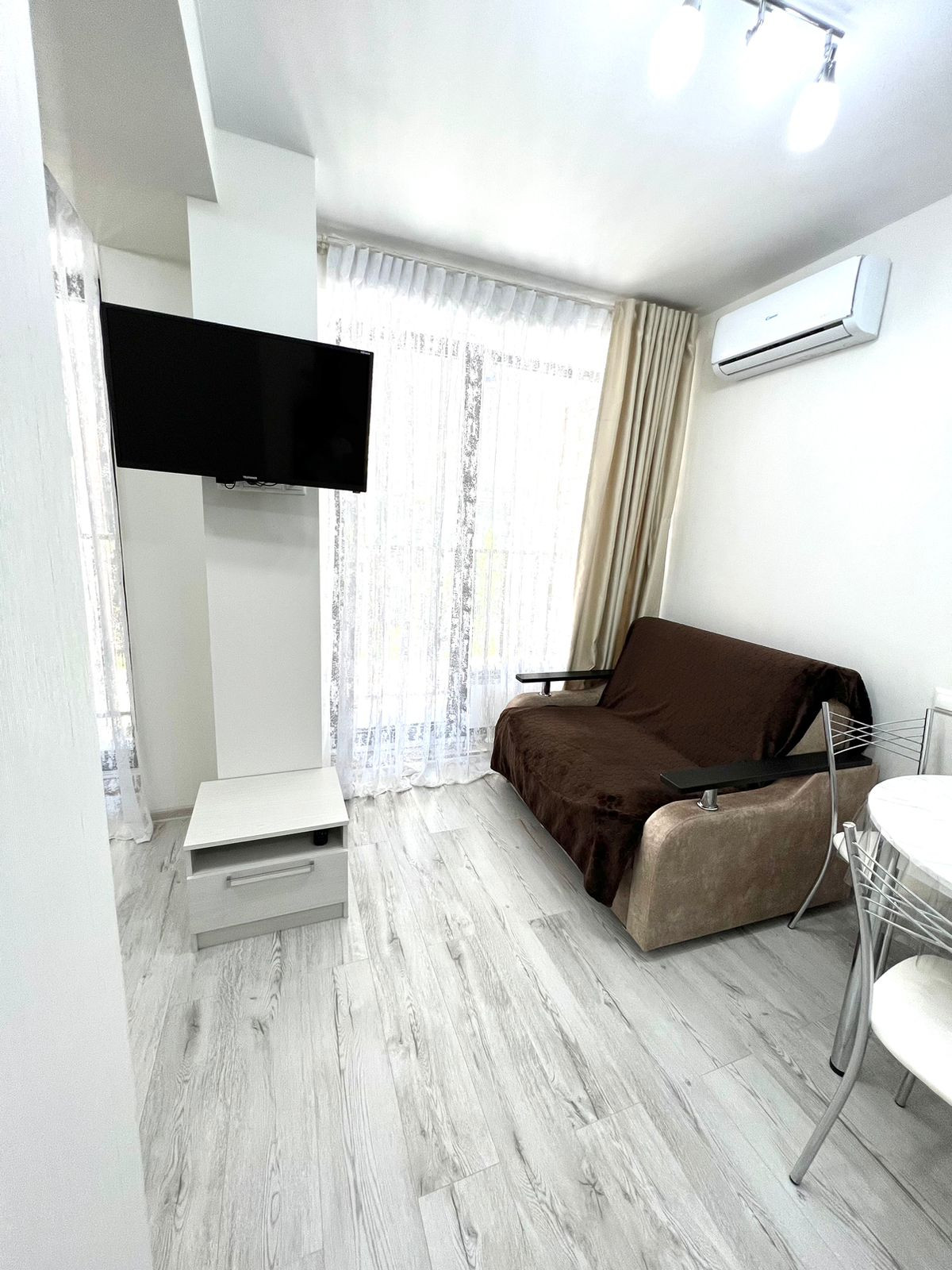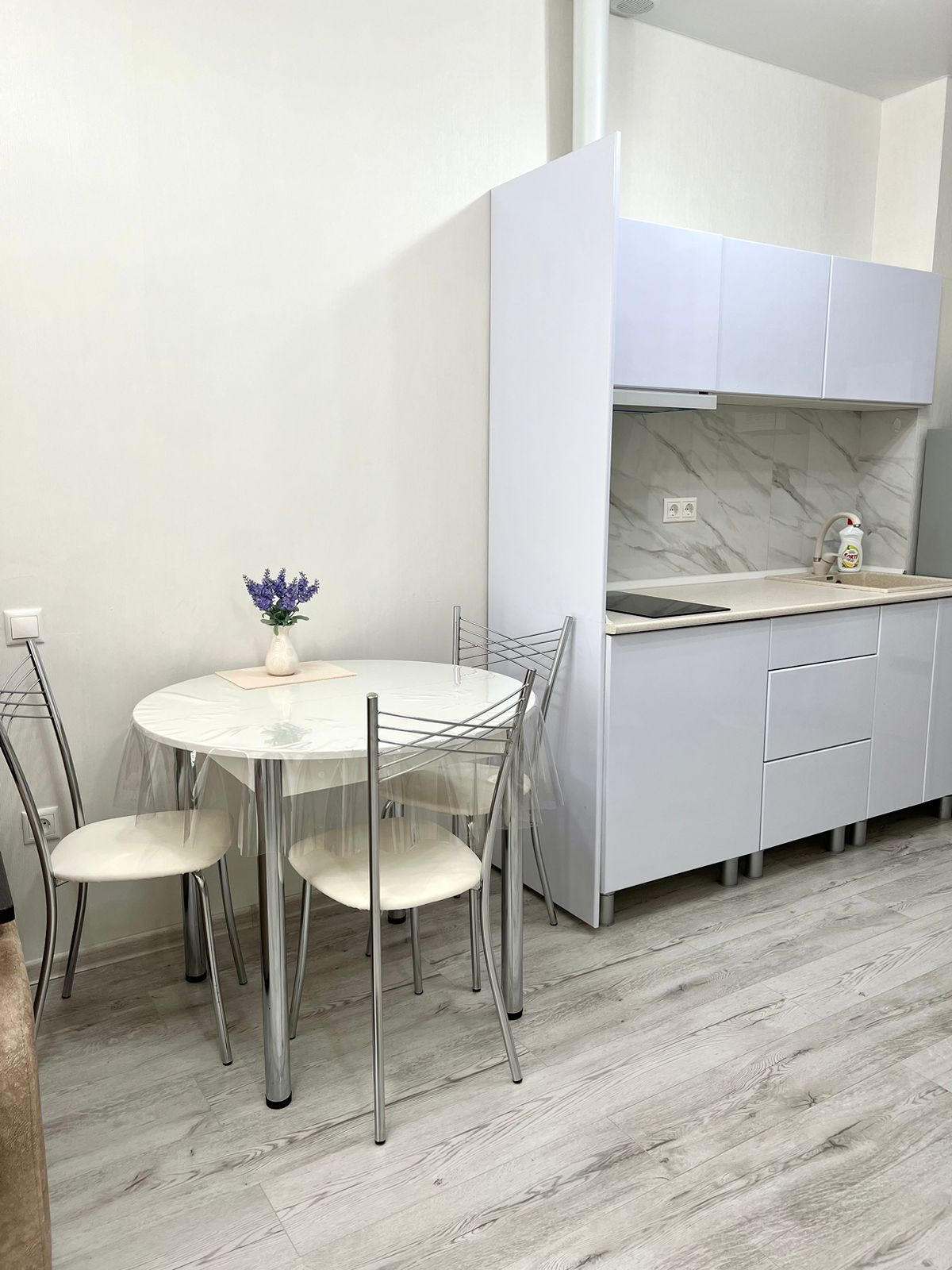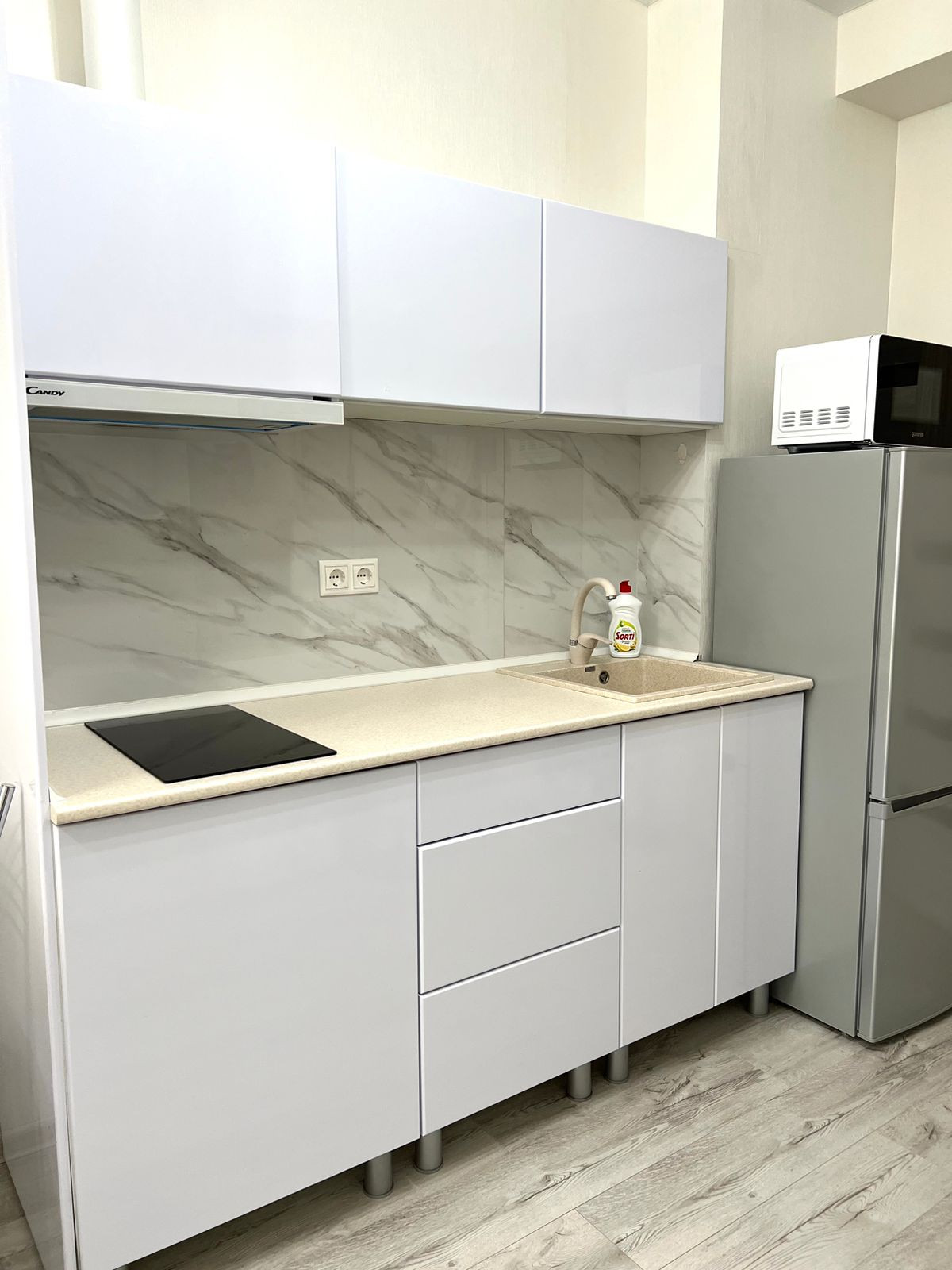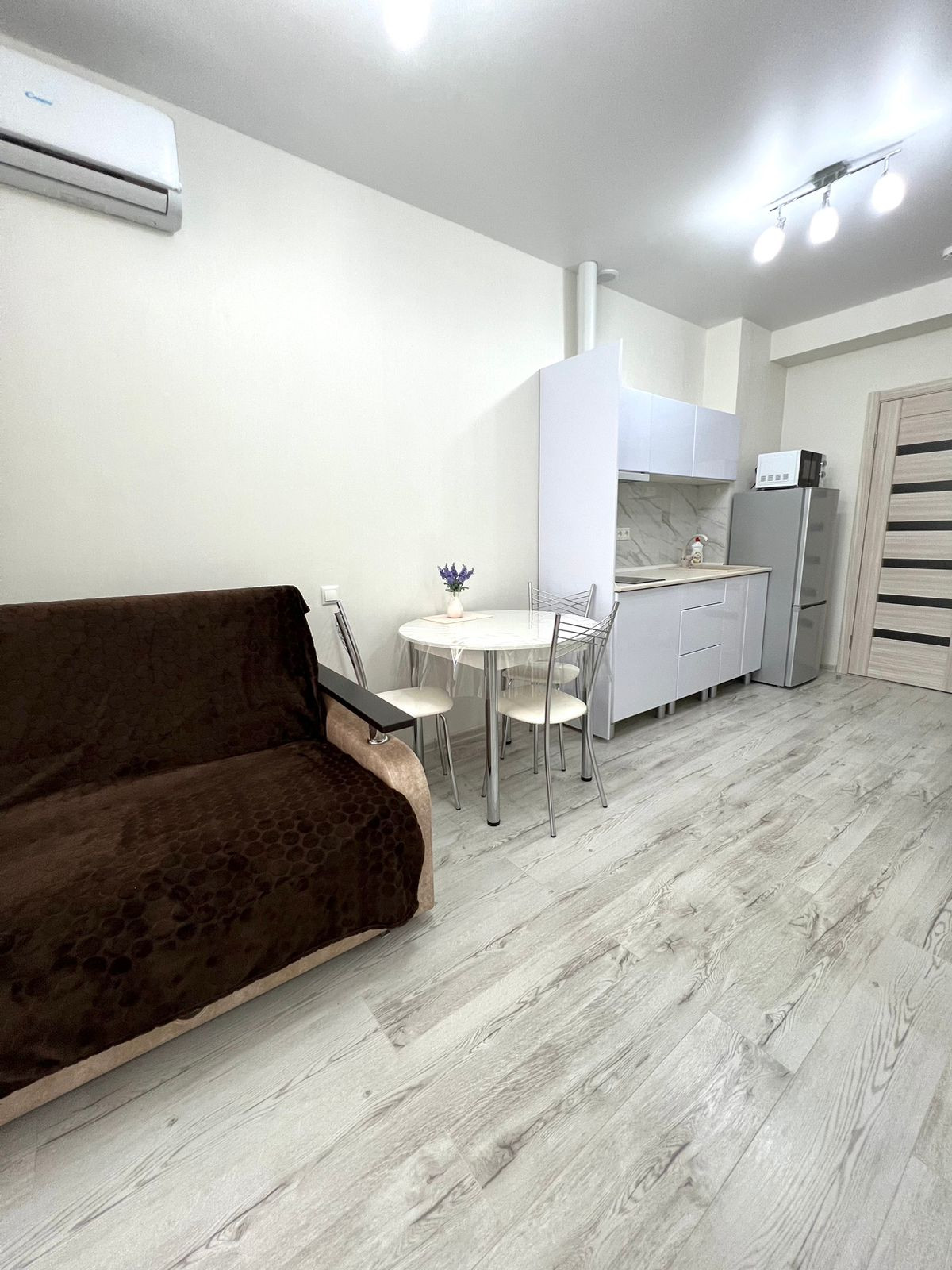 Оборудованная кухня со встроенной техникой. На кухне диван, который легко раскладывается на 2 спальных места.