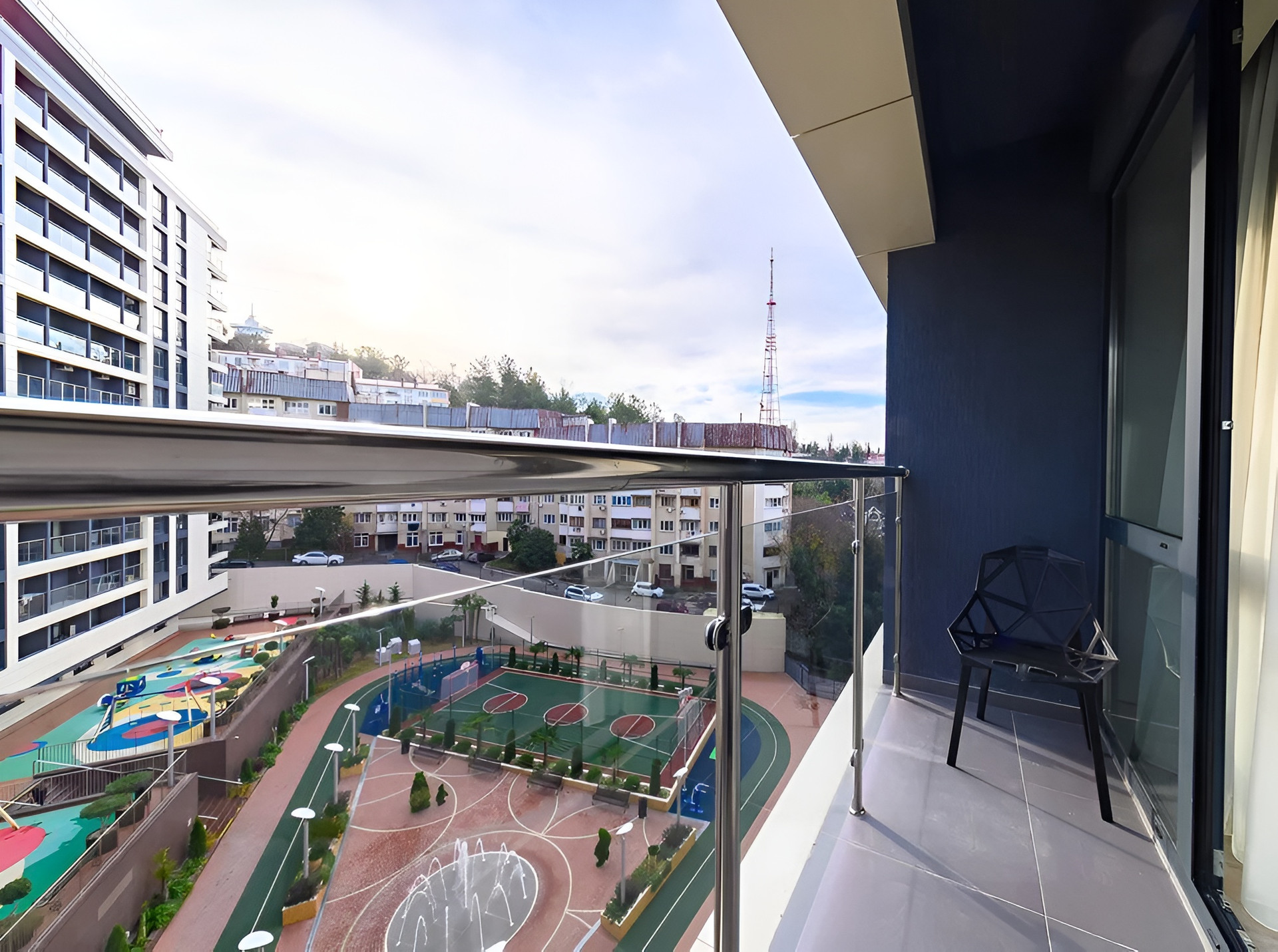 Во дворе есть несколько детских площадок, спортивная площадка, где можно играть в волейбол, баскетбол, футбол, теннис, а также пешеходные дорожки, зелёные зоны с ландшафтным дизайном и фонтаном, зоны отдыха и барбекю, гостевой паркинг, закрытая и охраняемая территория находится под видеонаблюдением.
