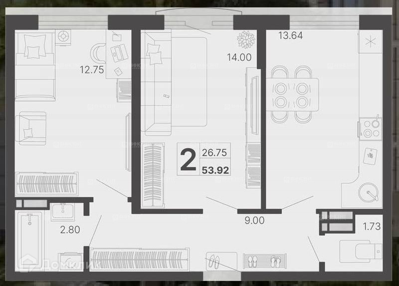 Общая площадь 53.92 м2
