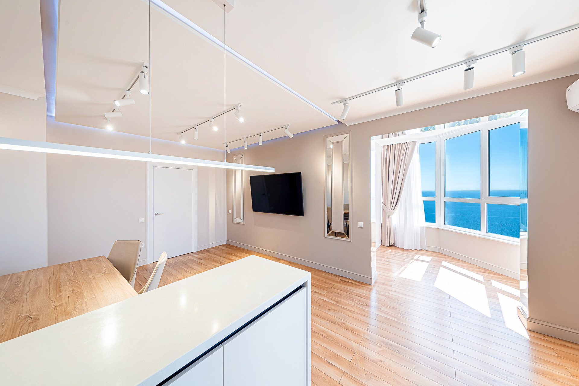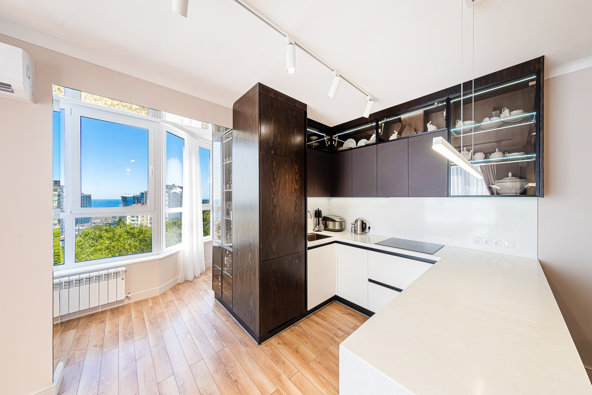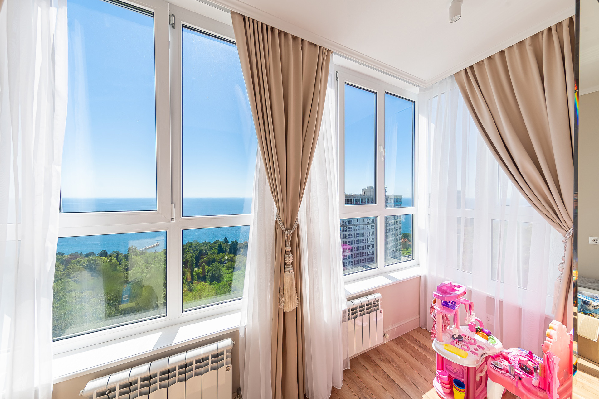 В квартире выполнен качественный ремонт, есть вся необходимая для проживания мебель и техника. Из окон c панорамным остеклением, открывается потрясающий вид на море, горы и город.