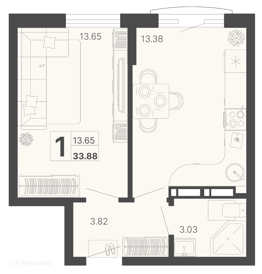 Общая площадь 33.88 м2