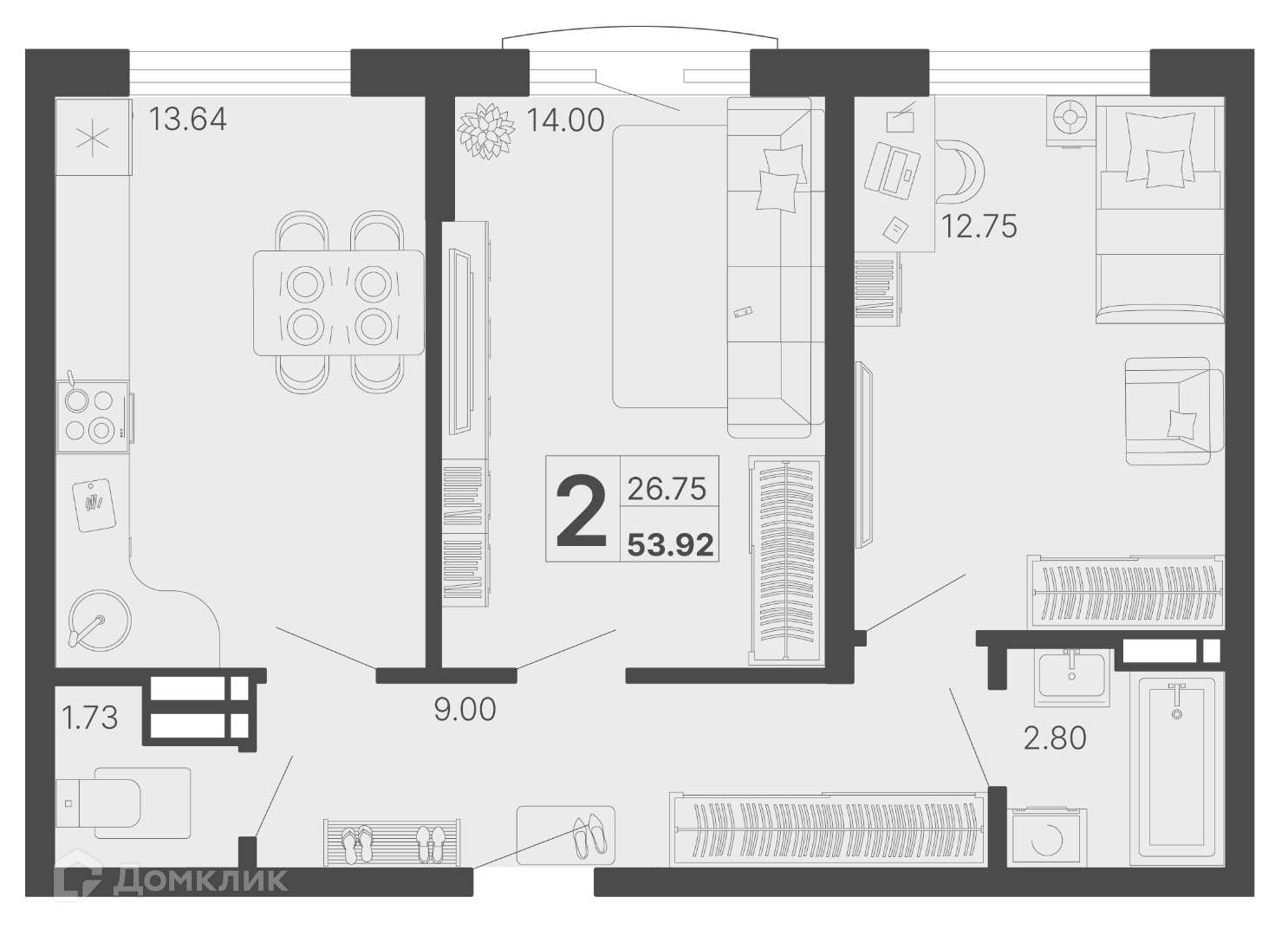 Общая площадь 53.92 м2