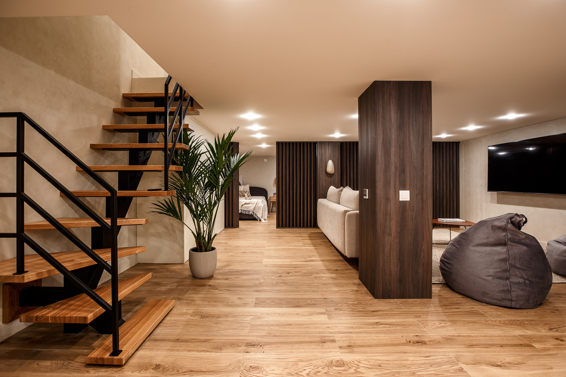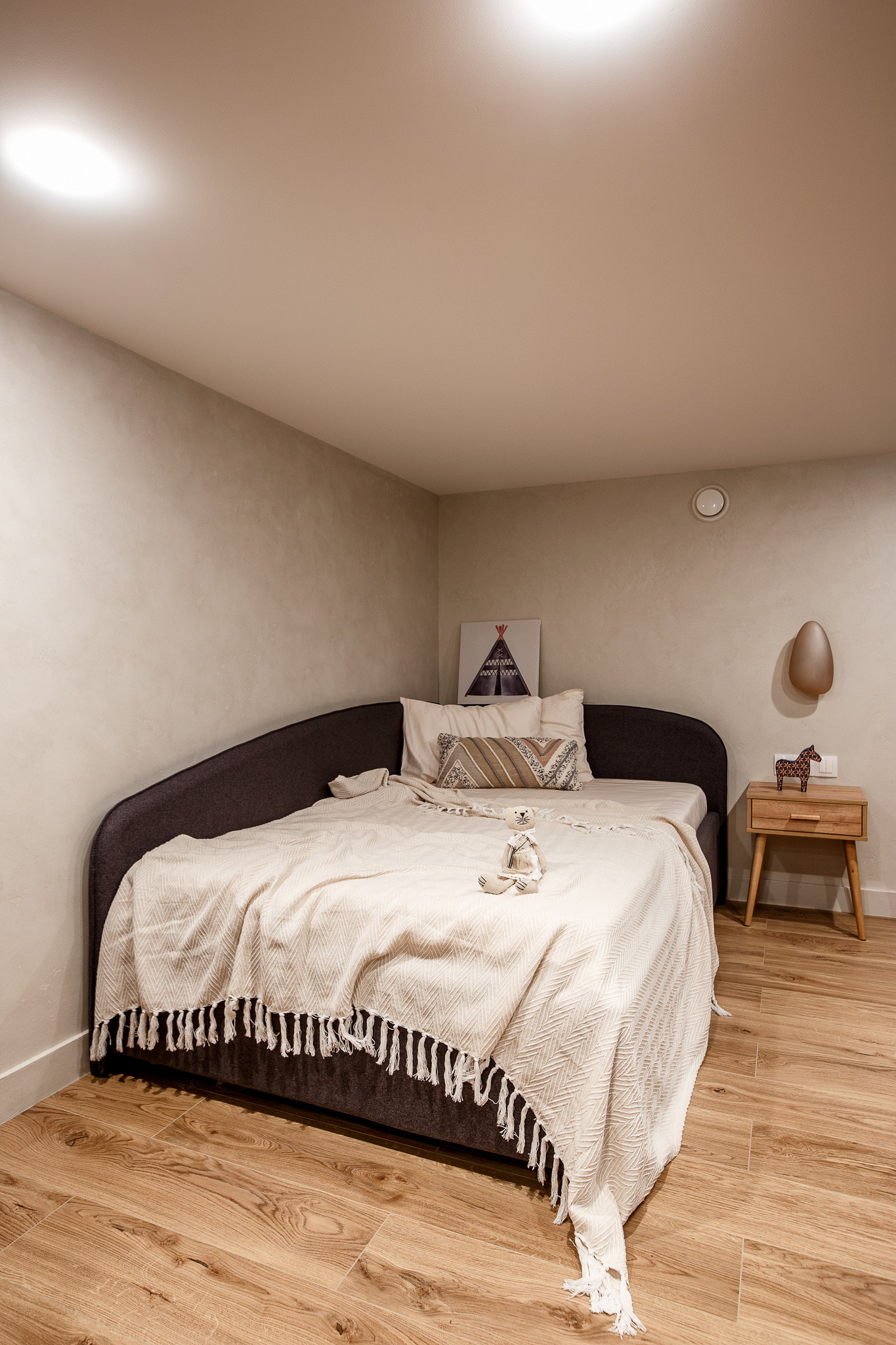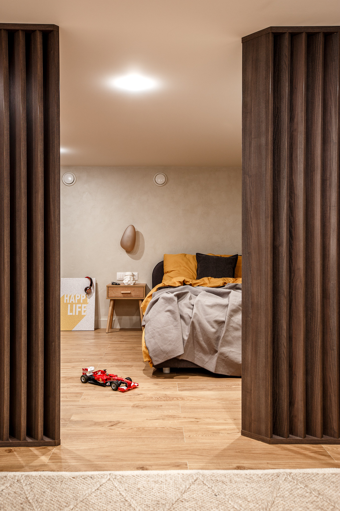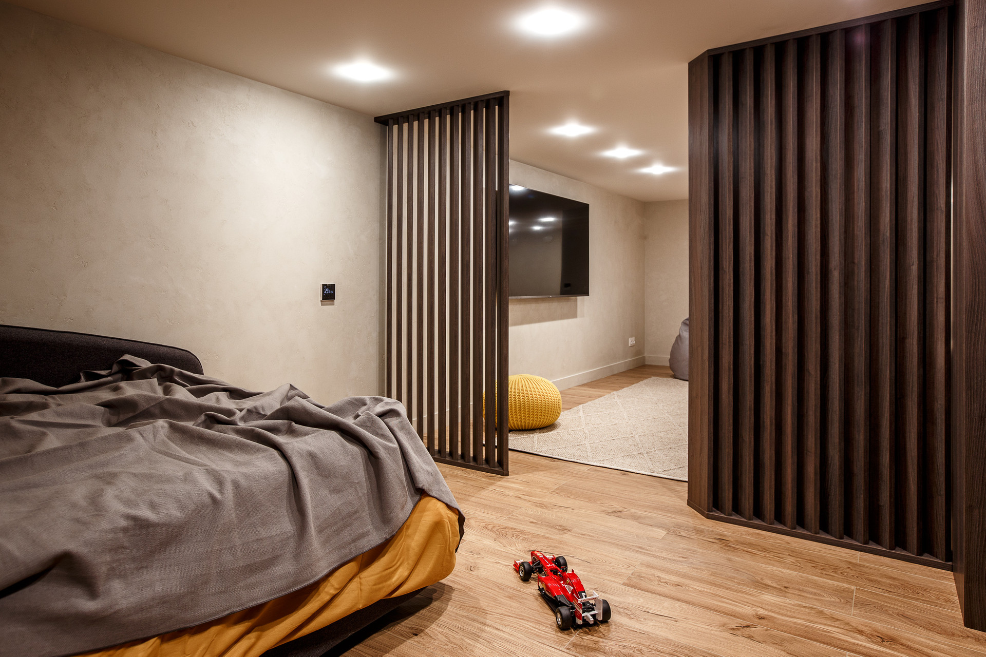 В нижнем этаже сделали 2 детские комнаты, зонировали деревянными перегородками,