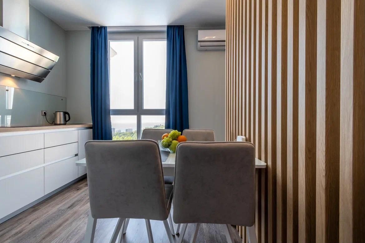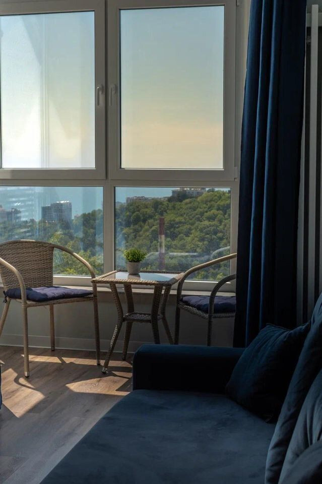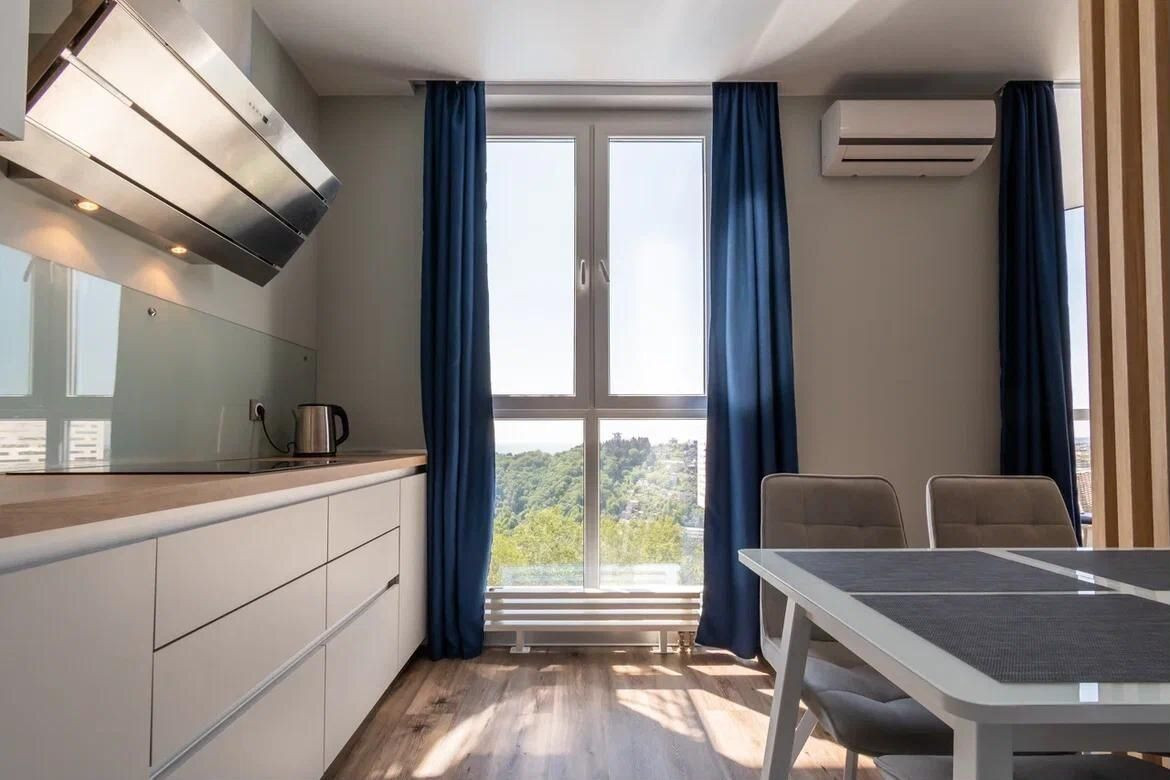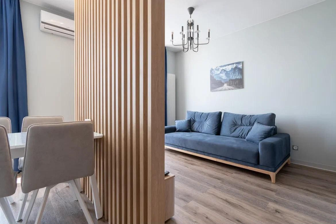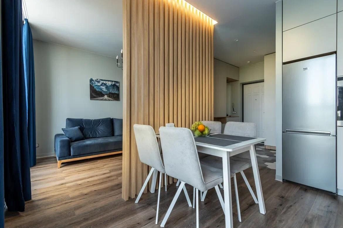 В этой квартире выполнен современный дизайнерский ремонт с использованием высококачественных материалов. Во дворе жилого комплекса вы найдёте всё необходимое для комфортного проживания: подогреваемый бассейн, ресторан, фитнес-центр, зону для барбекю, детские и спортивные площадки.