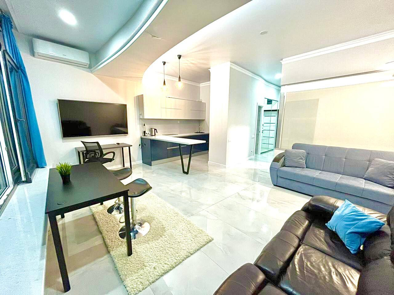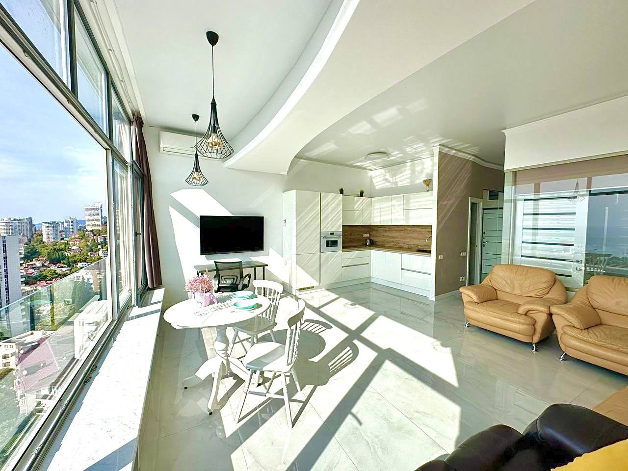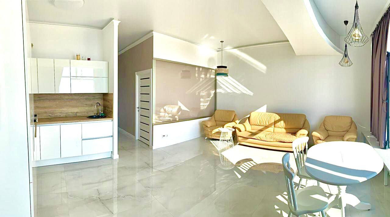 Комплекс - элитная новостройка, обеспечивающая высокий комфорт проживания. Квартира оборудована новейшей, дорогой техникой и текстилем, а ремонт и дизайн проект квартиры выполнен лучшими инженерами! Потрясающие панорамные окна и шикарные террасы открывают потрясающие виды на море и город курорn и на национальный парк - "Дендрарий"!!!