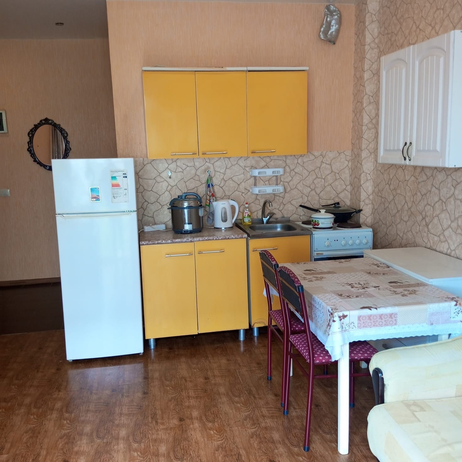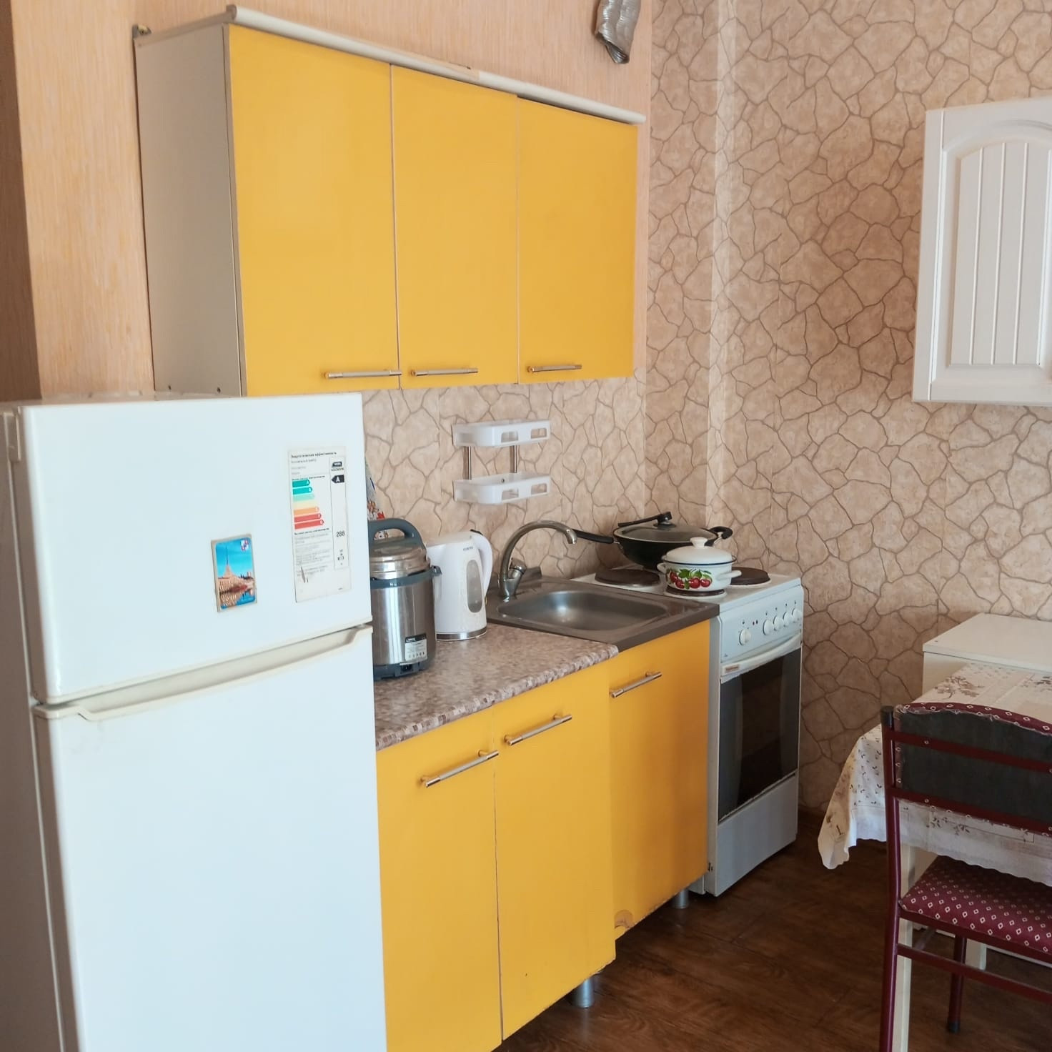 = в квартире остается абсолютно всё что на фото, включая кухню и технику: холодильник, стиральная машина, телевизор.