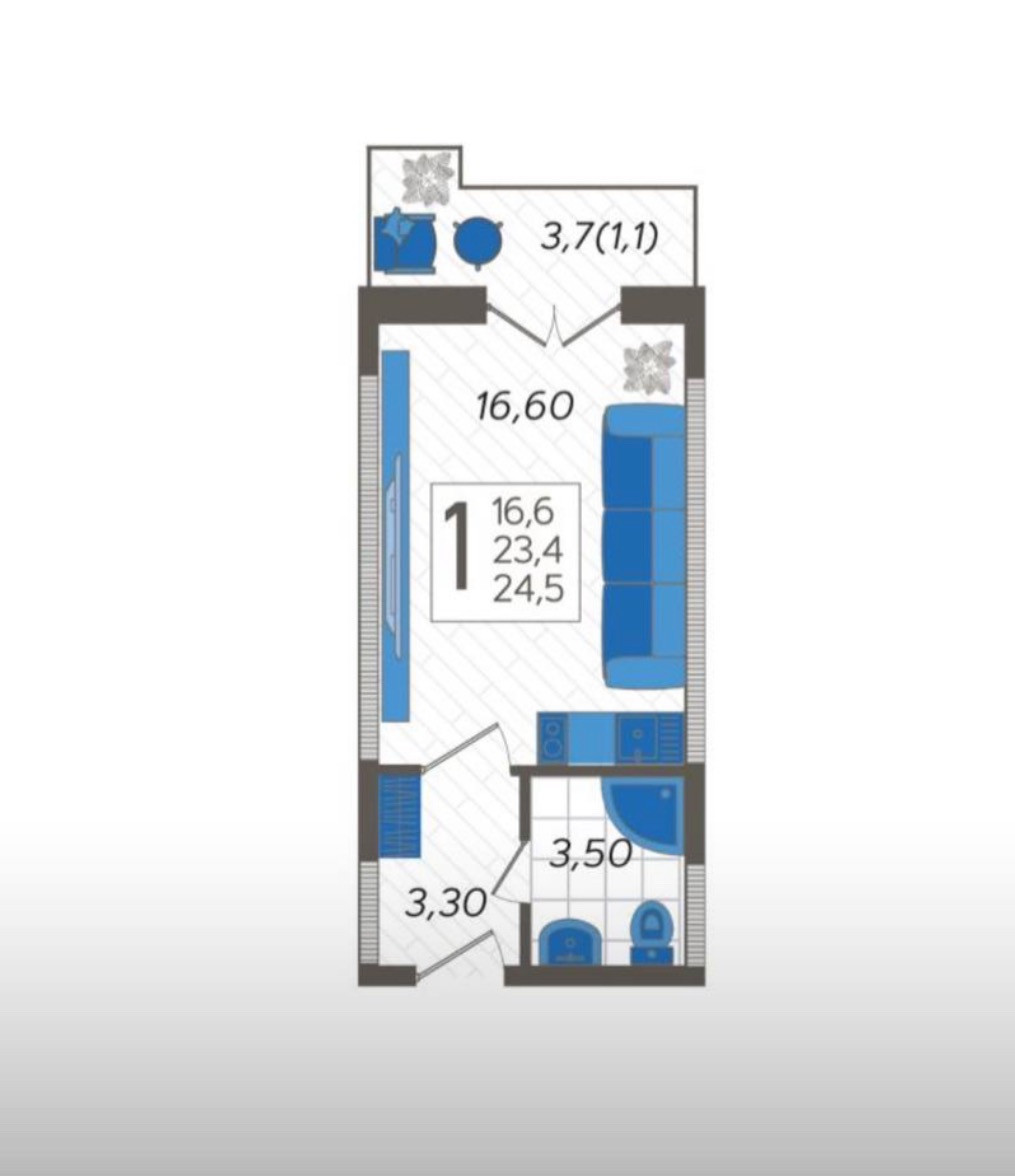 Общая площадь 24,5 кв.м + 3 кв.м. балкон.