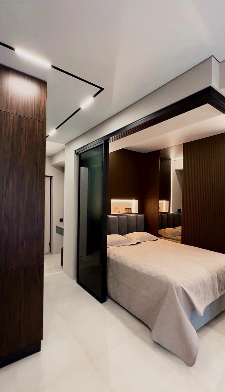 Зонирование спальни выполнено с помощью матовых стеклянных перегородок, которые отделяют кровать от остального пространства. Дверь в гардеробную тоже изготовлена из матового стекла, что создает ощущение легкости и пространства.