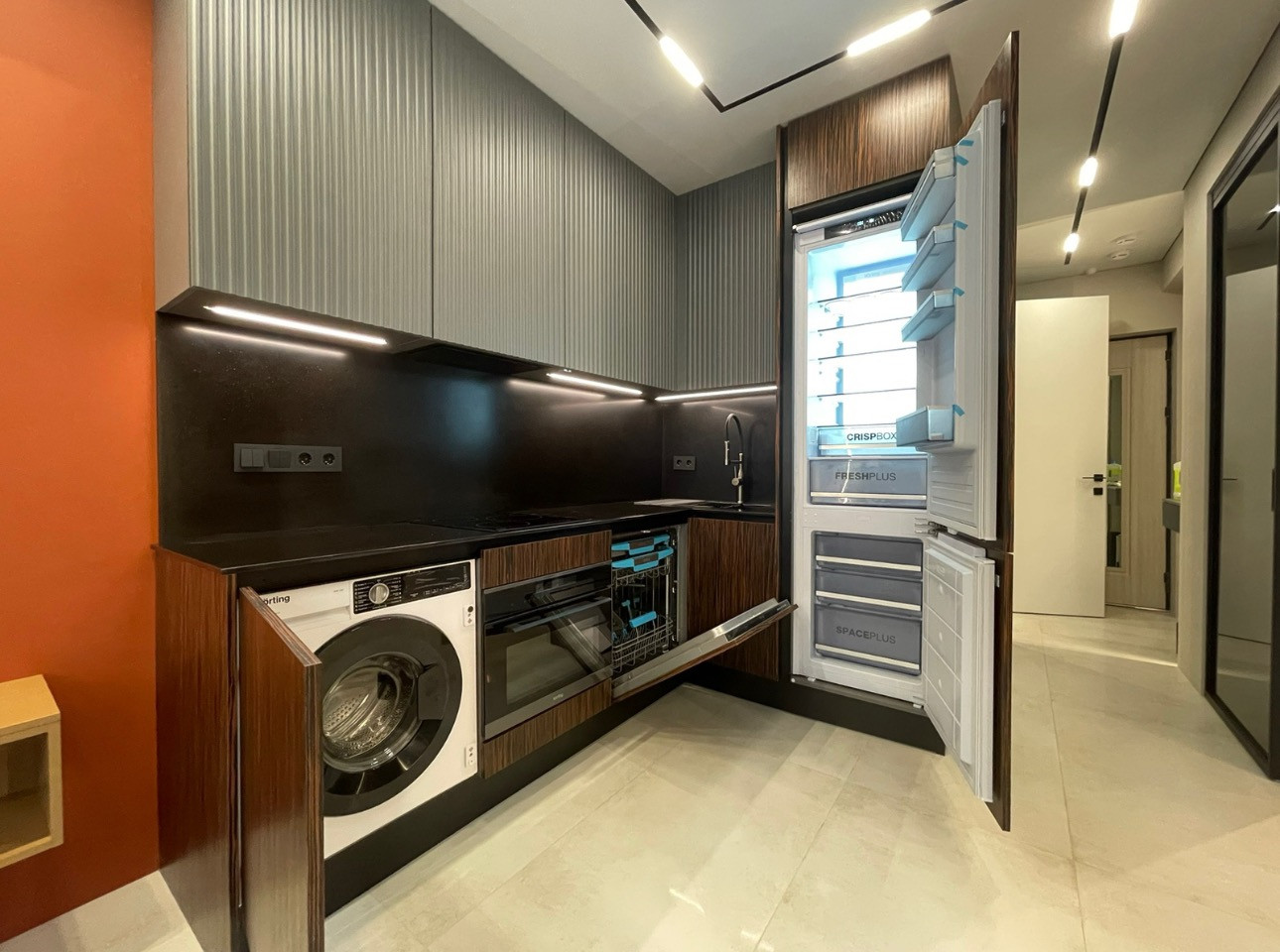 Встроенные светильники в стене и потолке равномерно освещают всю квартиру. Вся бытовая техника, включая холодильник, посудомоечную и стиральную машины, вытяжку, варочную панель, произведена в Германии. Для дополнительного комфорта установлена сплит-система итальянского производства.