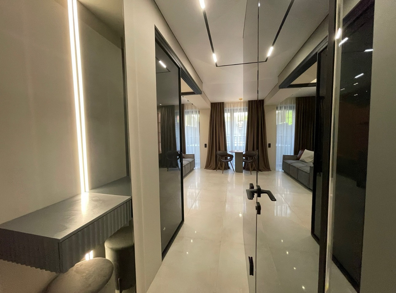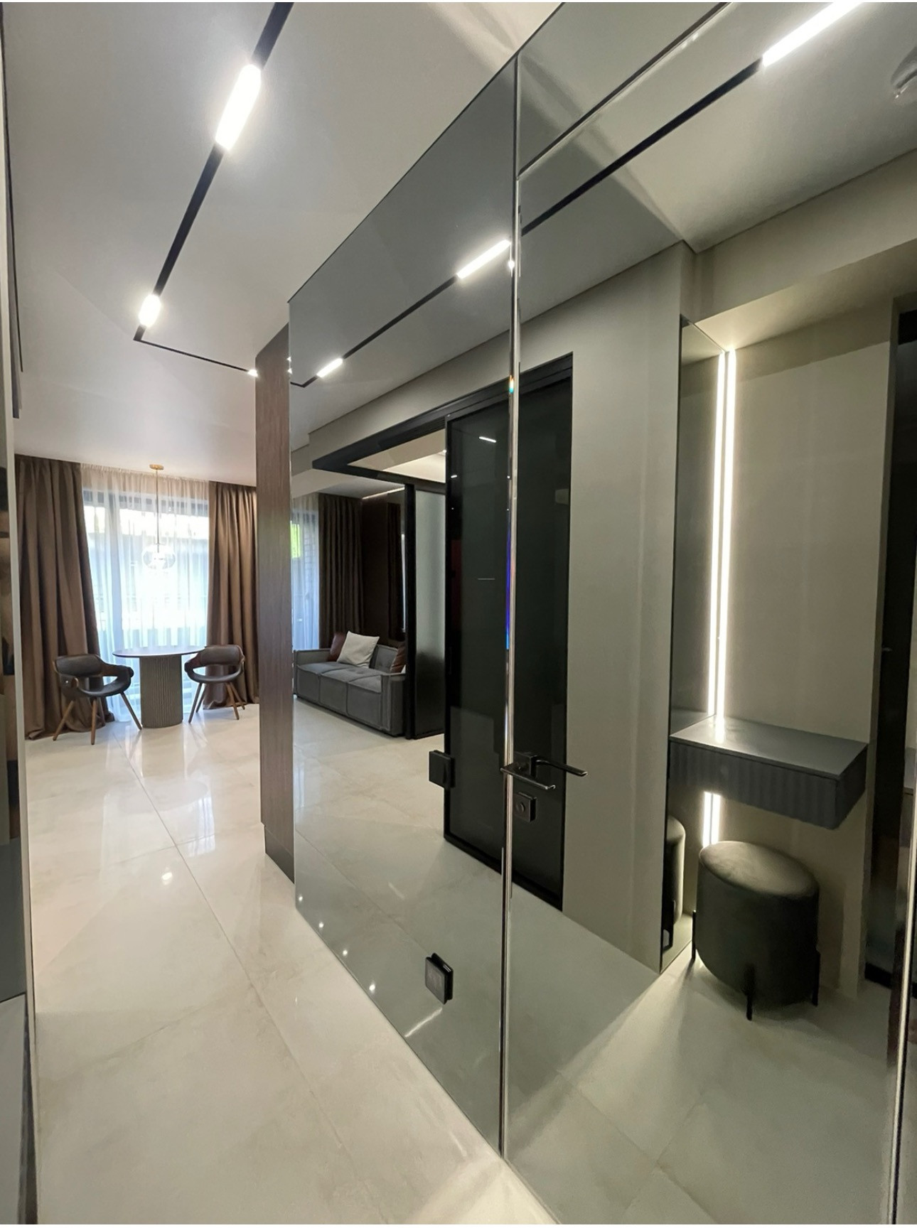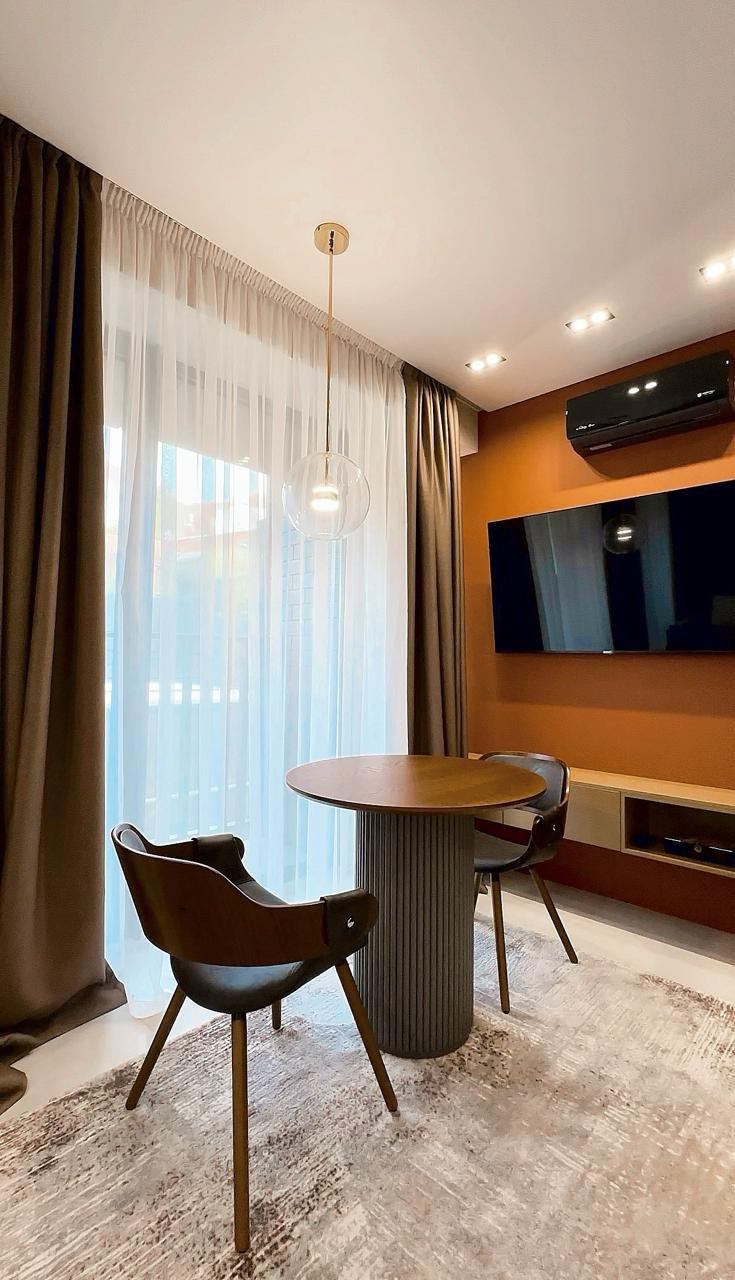 Квартира площадью 32 квадратных метров в комплексе бизнес-класса представляет собой стильное пространство с дорогим дизайнерским ремонтом. Интерьер выполнен в темных тонах, что создает уютную и спокойную атмосферу.