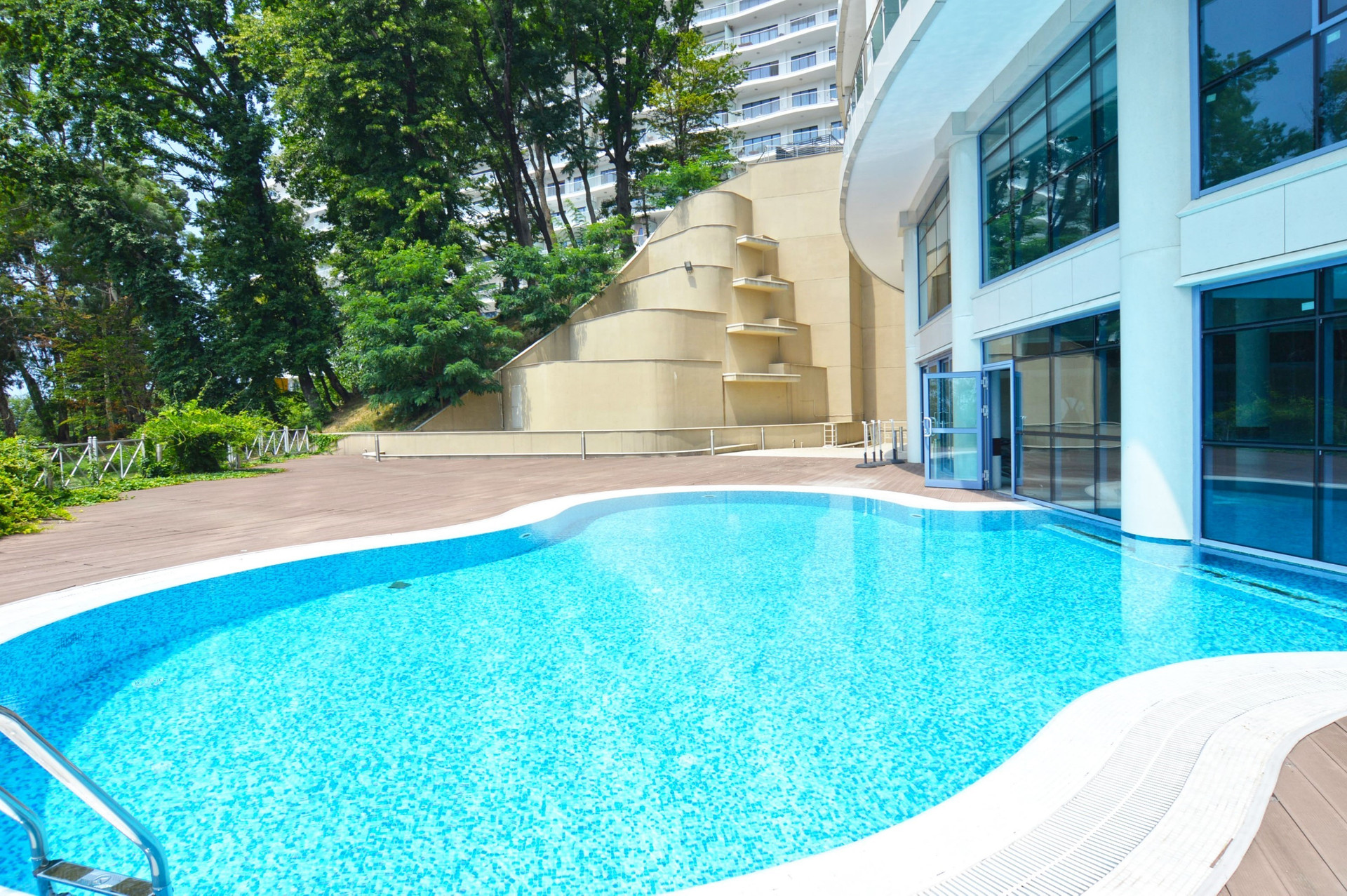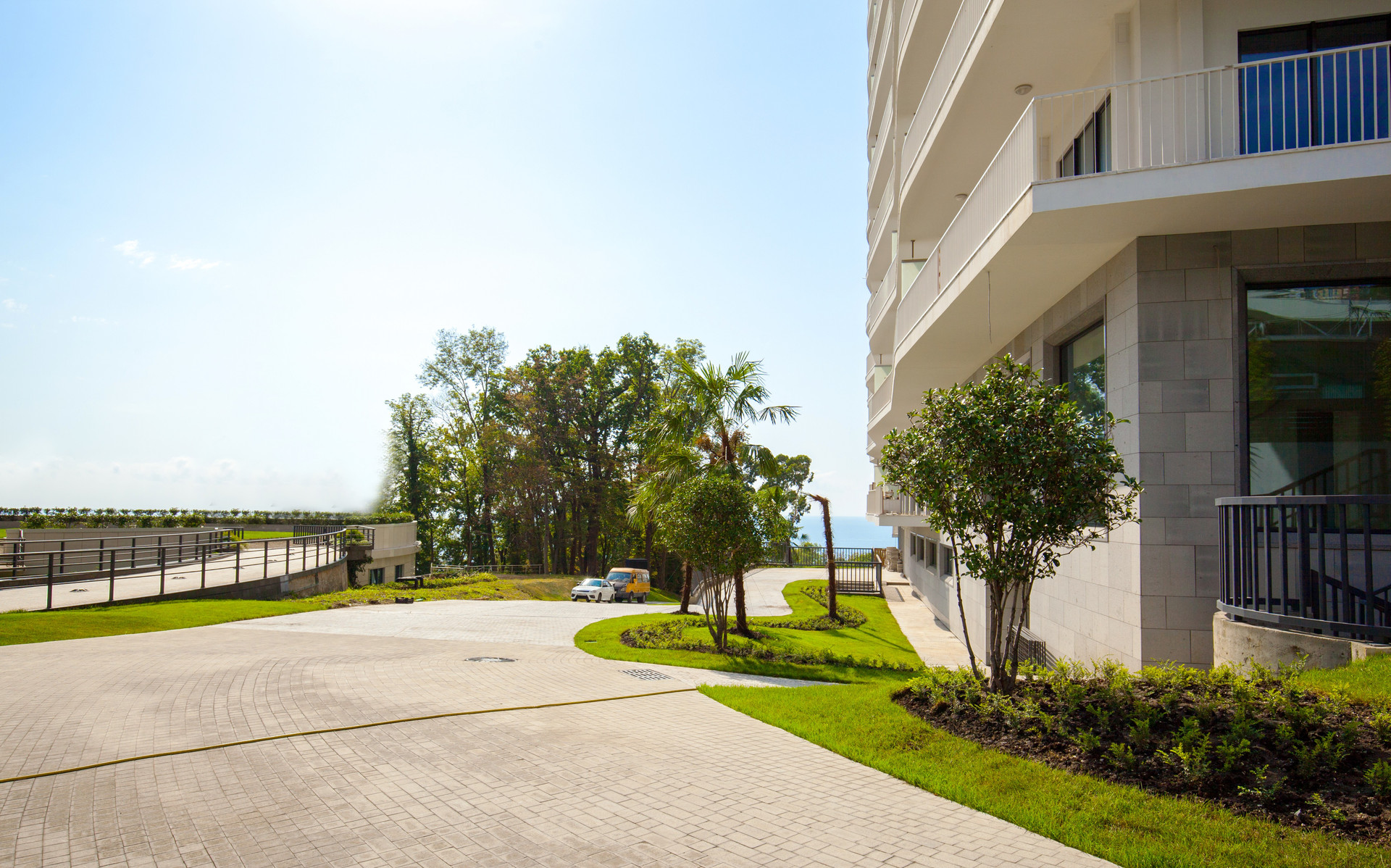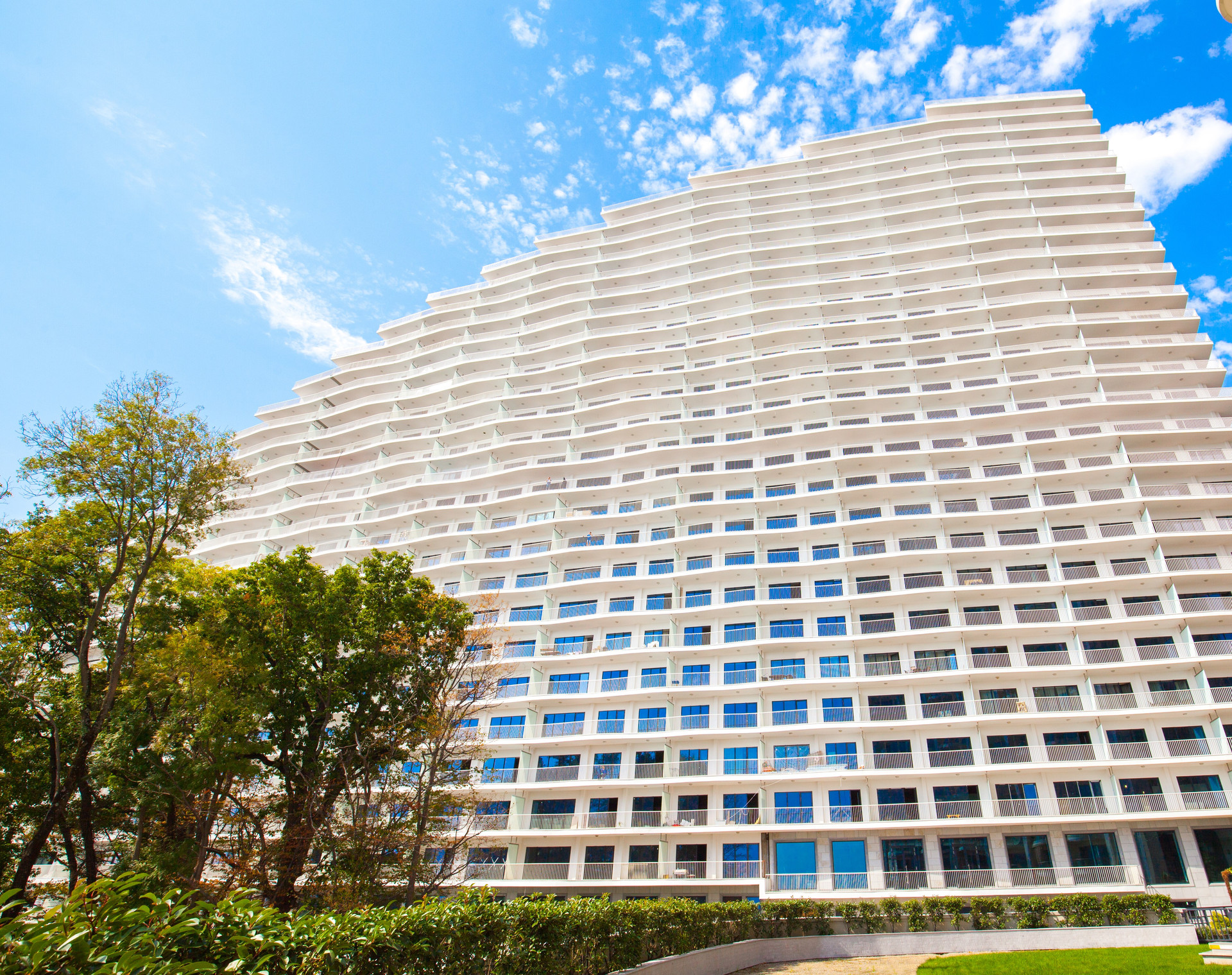 Территория Комплекса оформлена ландшафтным озеленением, большой бассейн с видом на море, тренажёрный зал, собственный охраняемый пляж, панорамные лифты «Otis» и так же на территории комплекса несколько престижных ресторанов.