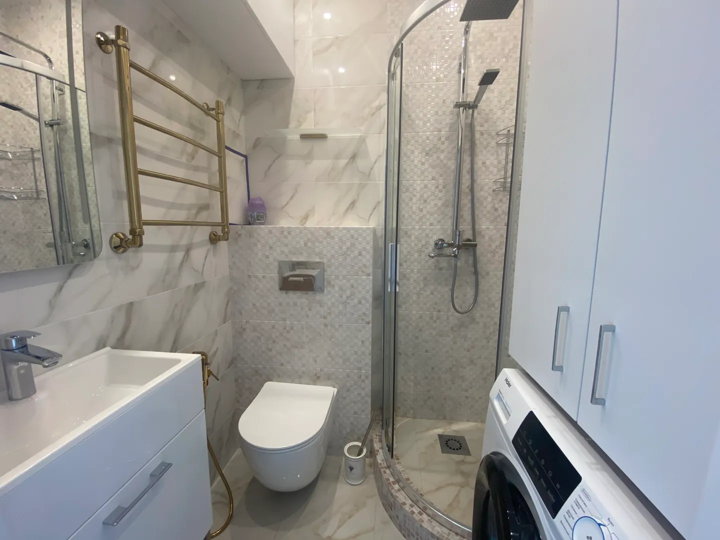 Ванная комната с душем, установлена стиральная машина. Комфортно разместятся 2-3 человека. В квартире есть все необходимое для комфортной жизни. Заезжай - живи