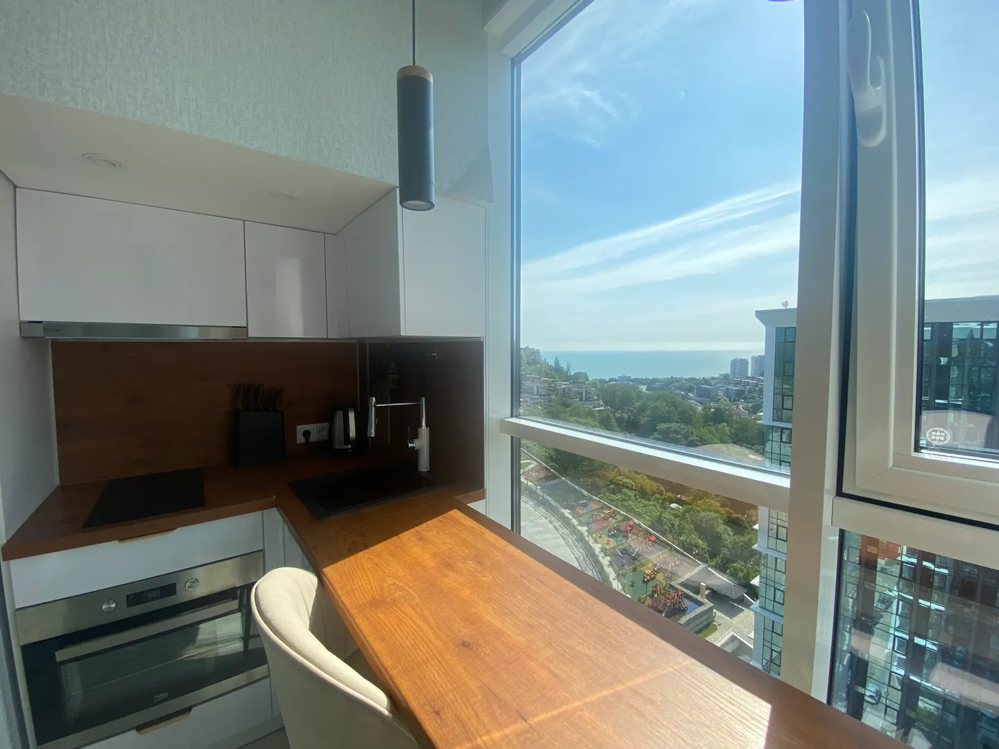 Организована кухня со всей необходимой техникой, барная стойка с прекрасным видом на море.