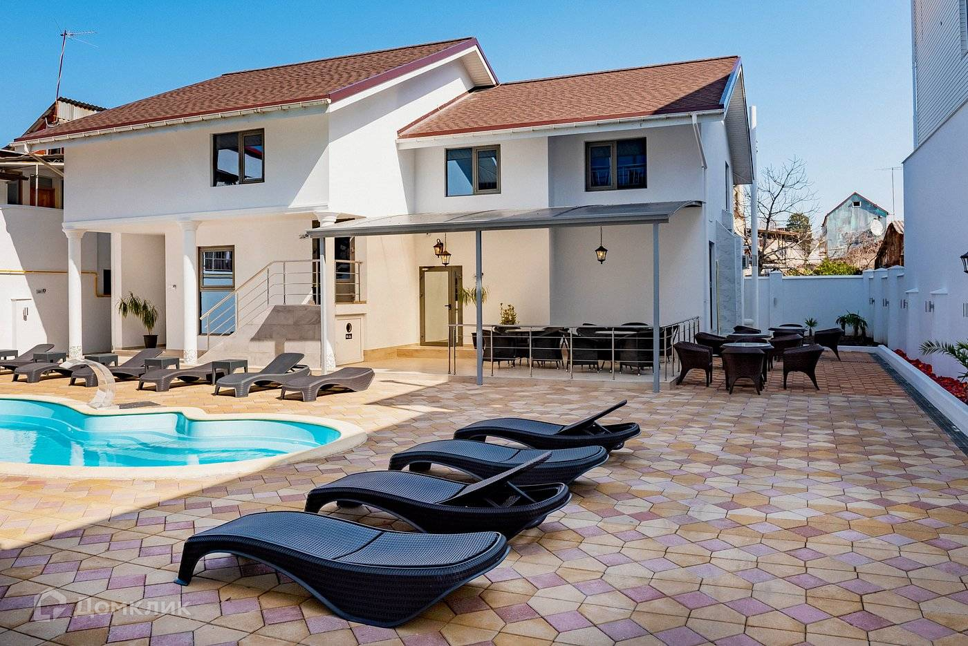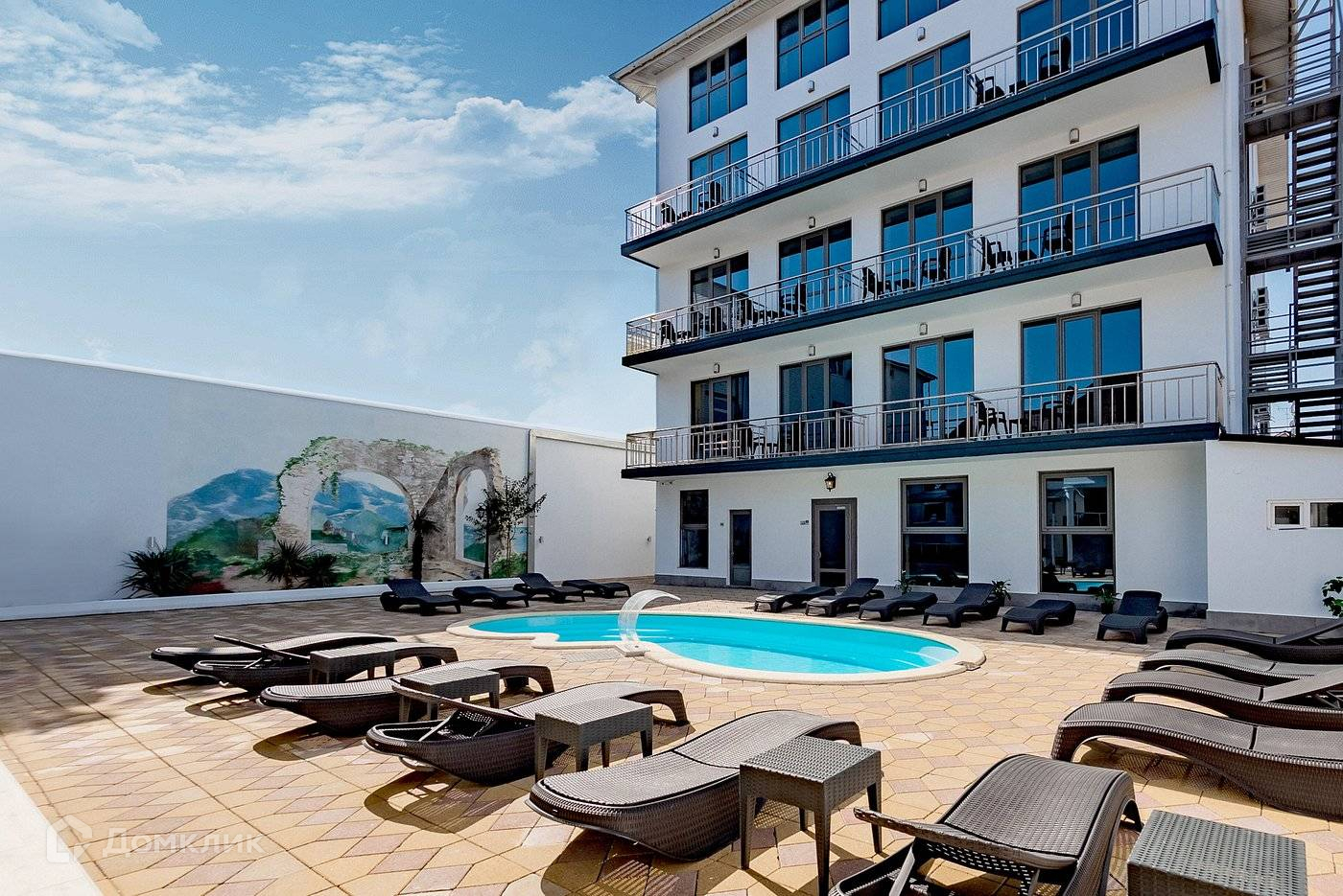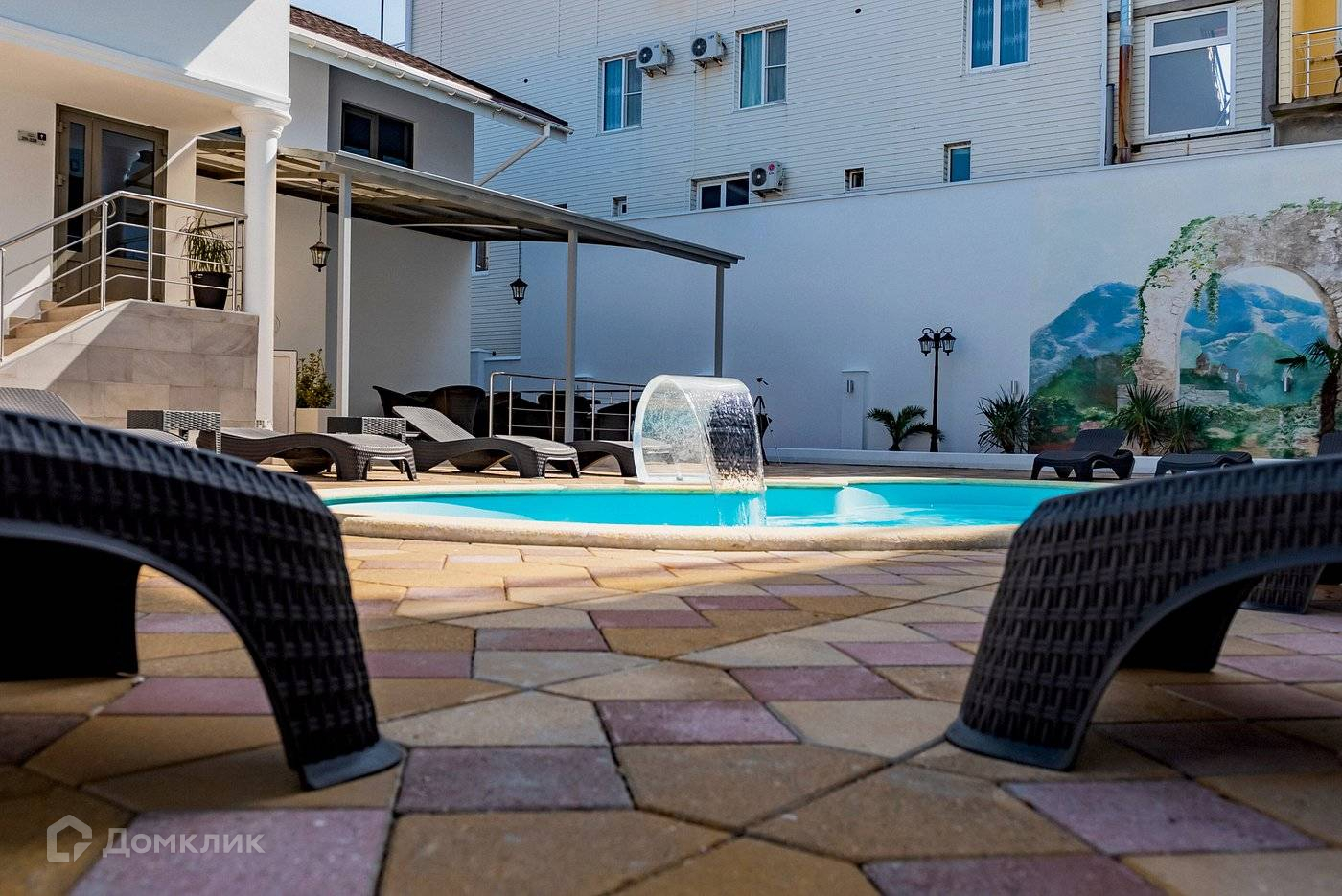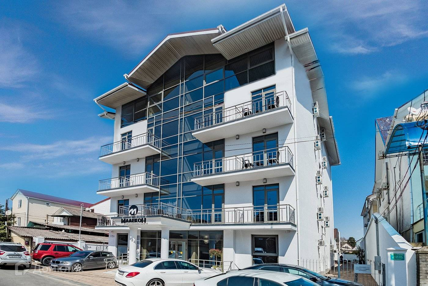 Закрытая территория с подогреваемым бассейном и своей зоной отдыха. Белоснежное здание отеля с высокими панорамными окнами, с современными, прекрасно меблированными номерами и лифтом, возвышается над окрестностями и из него открывается изумительная панорама природы субтропической зоны: безбрежные морские просторы, величественные отроги Кавказских гор, зелень южного побережья.