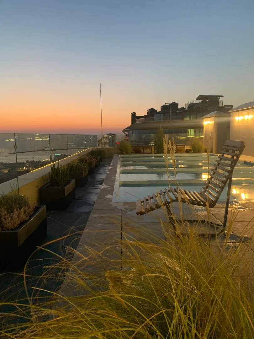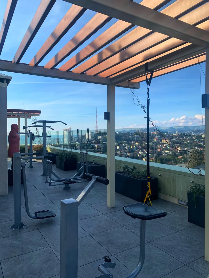 На крыше комплекса - бассейн, тренажёры, лежаки, места оборудованные для отдыха.