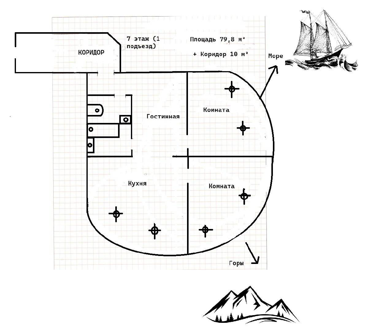 Площадь квартиры 79,8 кв.м + коридор 10 кв.м.