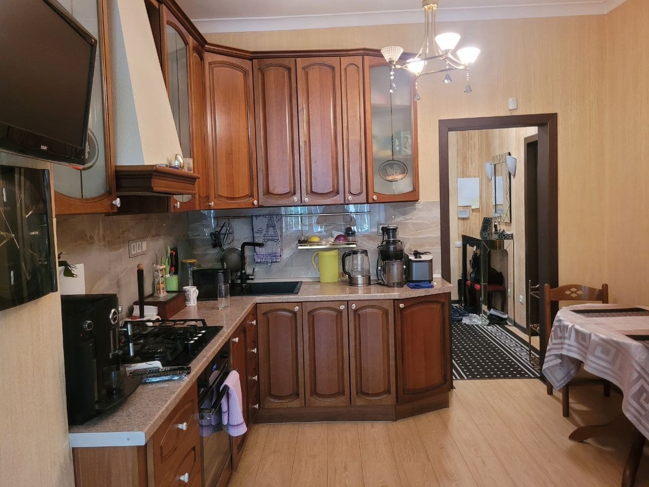 В квартире: просторная кухня – столовая с выходом в собственный сад, большая гостиная, спальня, рабочий кабинет, совмещенный с/у.  Вход/выход как через  подъезд, так и через зеленую зону (прямо к остановке общественного транспорта). Выполнен качественный ремонт из дорогих материалов.