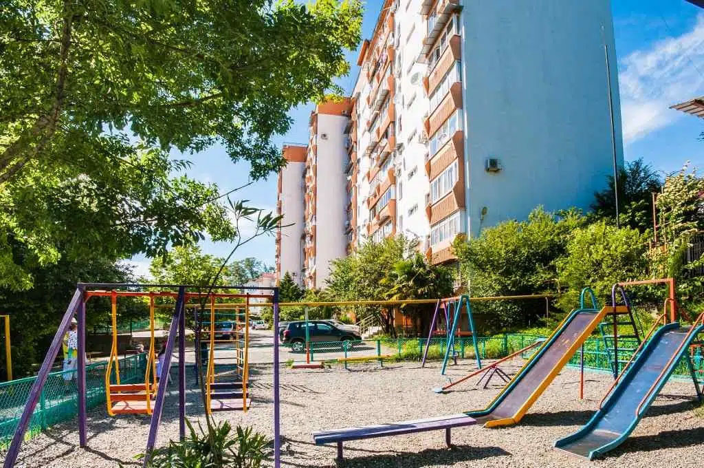 Микрорайн отапливается собственной котельной, дом подключен к магистральному газу. Коммунальные платежи — одни из самых низких по всему Большому Сочи. Двор просторный, детская и спортивная площадки свои, места для парковки достаточно, соседи отличные, все местные, в основном бабушки\дедушки, бывшие сотрудники пансионата «Спутник».