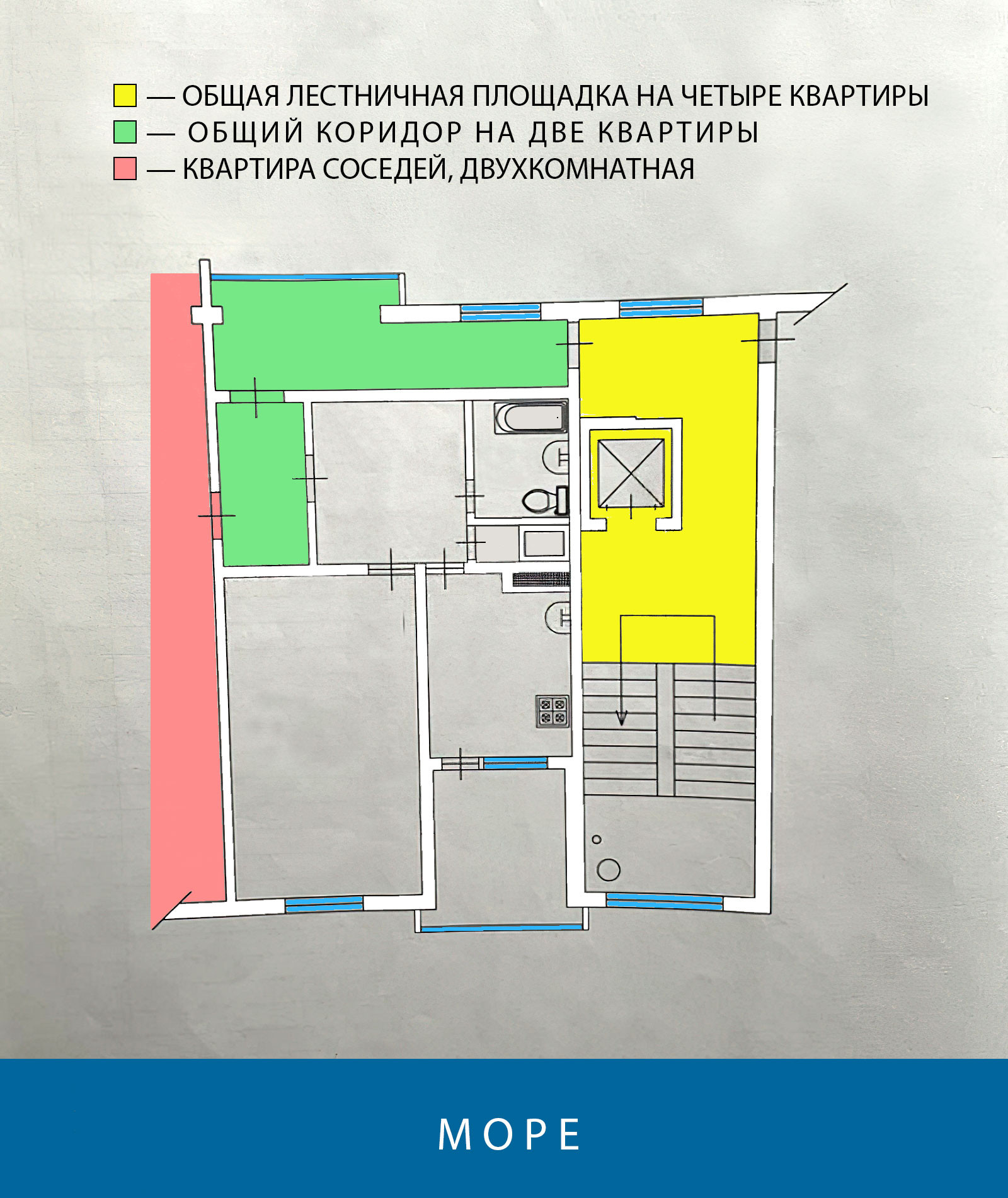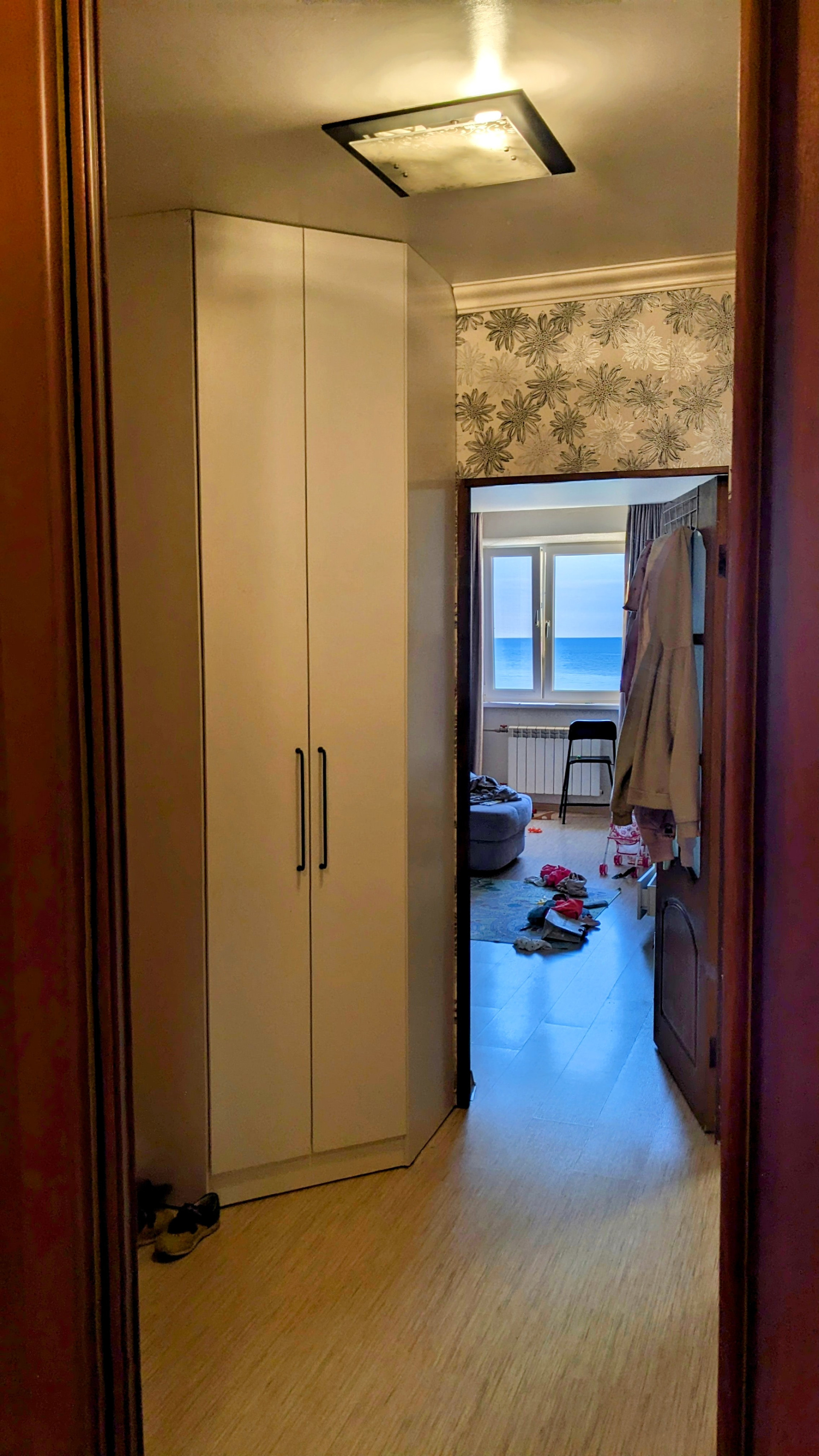 Расстояние до моря по прямой 800 метров, пешком по дороге 20 минут. Высота квартиры над уровнем моря 160 метров. Главное достоинство — вид. Не на кусочек моря среди курятников, не на дырку с морем между гаражей, а настоящий вид на море, каким он должен быть — если вы понимаете в этом толк.