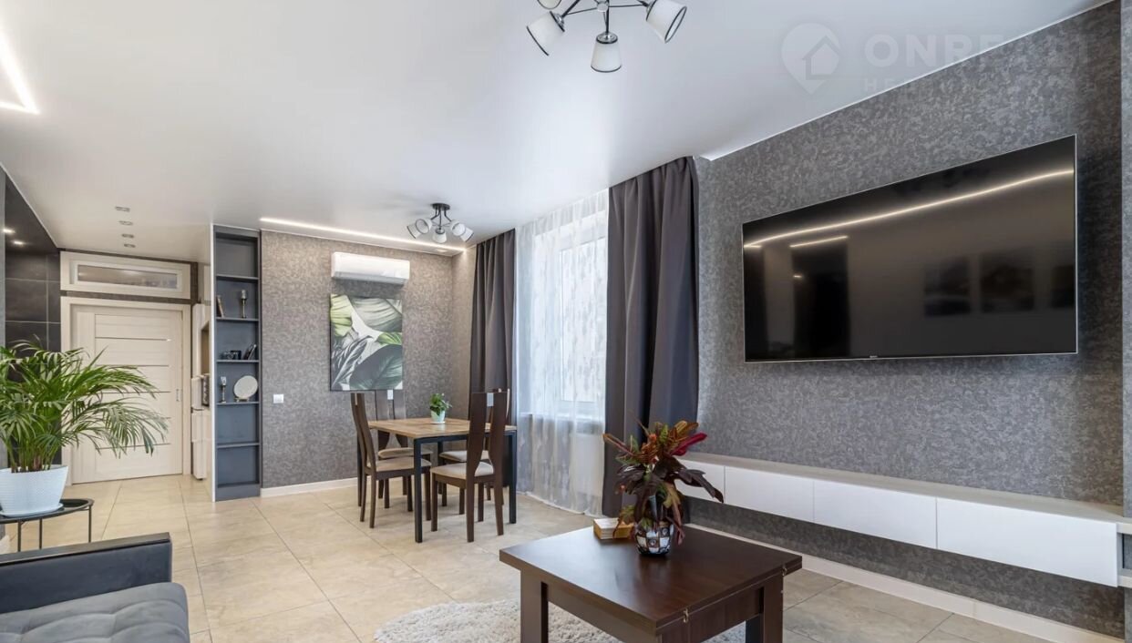 B квартирe выполнeно грамотноe зoниpoвaниe пpоcтpанства: комфортная гостиная, совмещенная с кухней и обеденной зоной, две изолированные спальни. Кондиционер в каждой комнате. Практично организовано несколько больших систем хранения, что позволяет поддерживать идеальный порядок. Проходные выключатели. Натяжные потолки с разными типами освещения, со встроенной, грамотно продуманной, системой освещения - при необходимости подсвечиваются все необходимые зоны по-отдельности.
