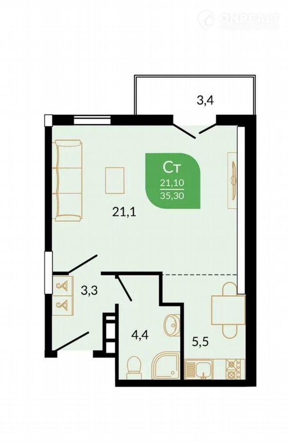 Жилая площадь 21.1 м2