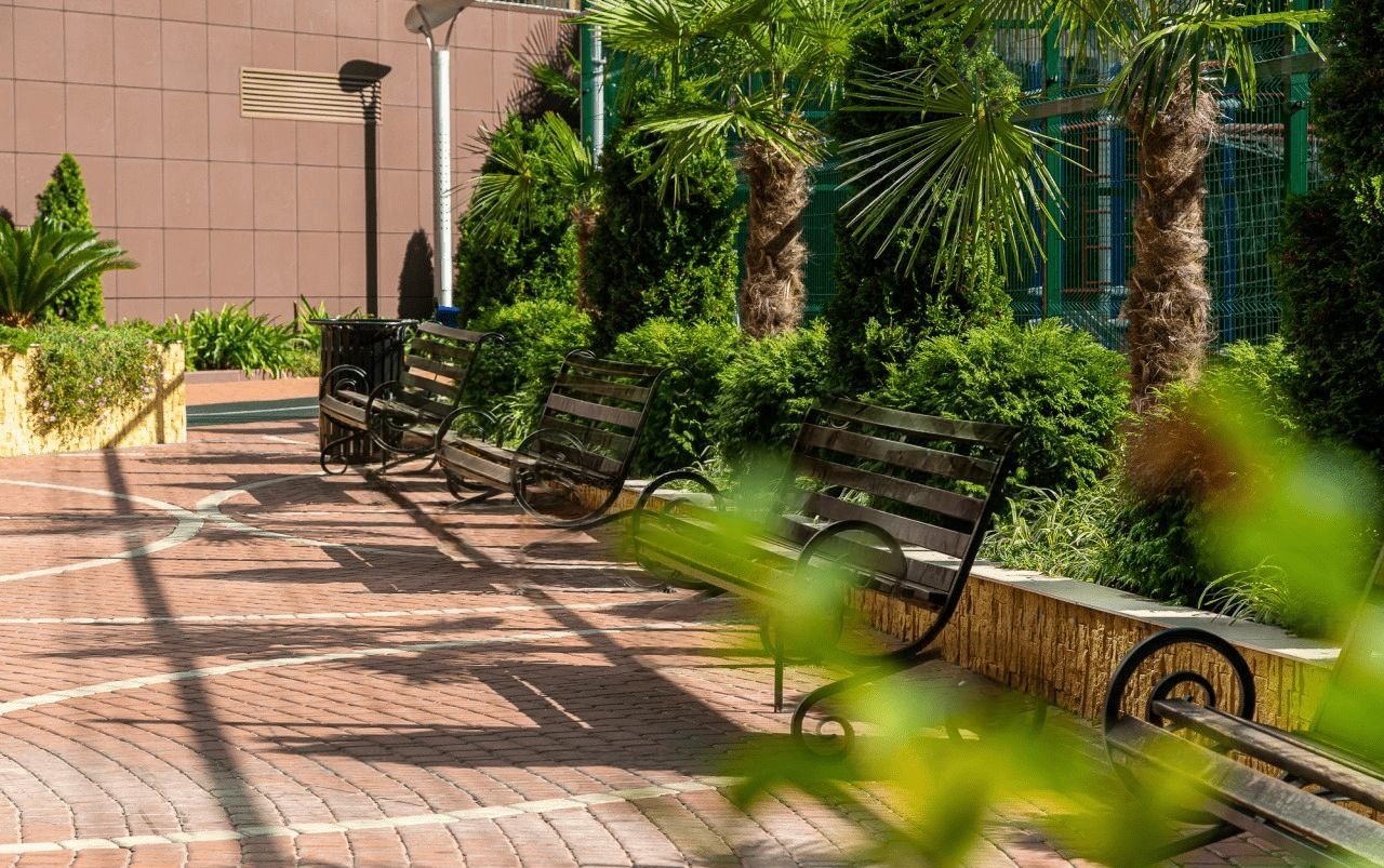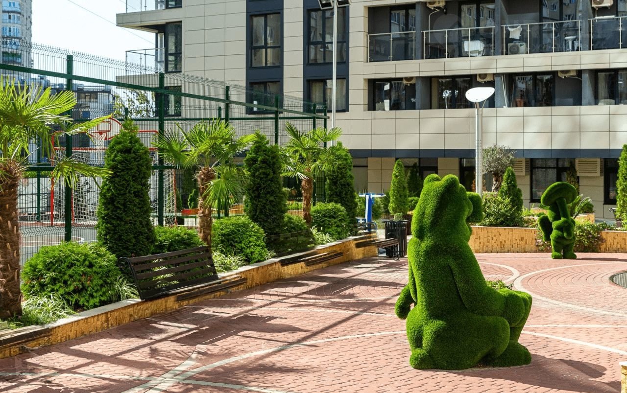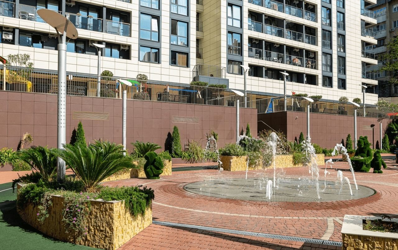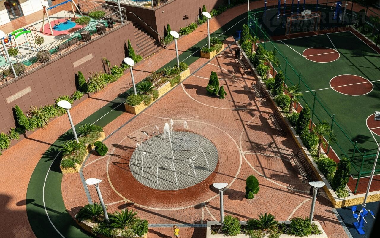 Во дворе есть несколько детских площадок, спортивная площадка, где можно играть в волейбол, баскетбол, футбол, теннис, а также пешеходные дорожки, зеленые зоны с ландшафтным дизайном и фонтаном, зоны отдыха и барбекю, гостевой паркинг. закрытая и охраняемая территория находится под видеонаблюдением.