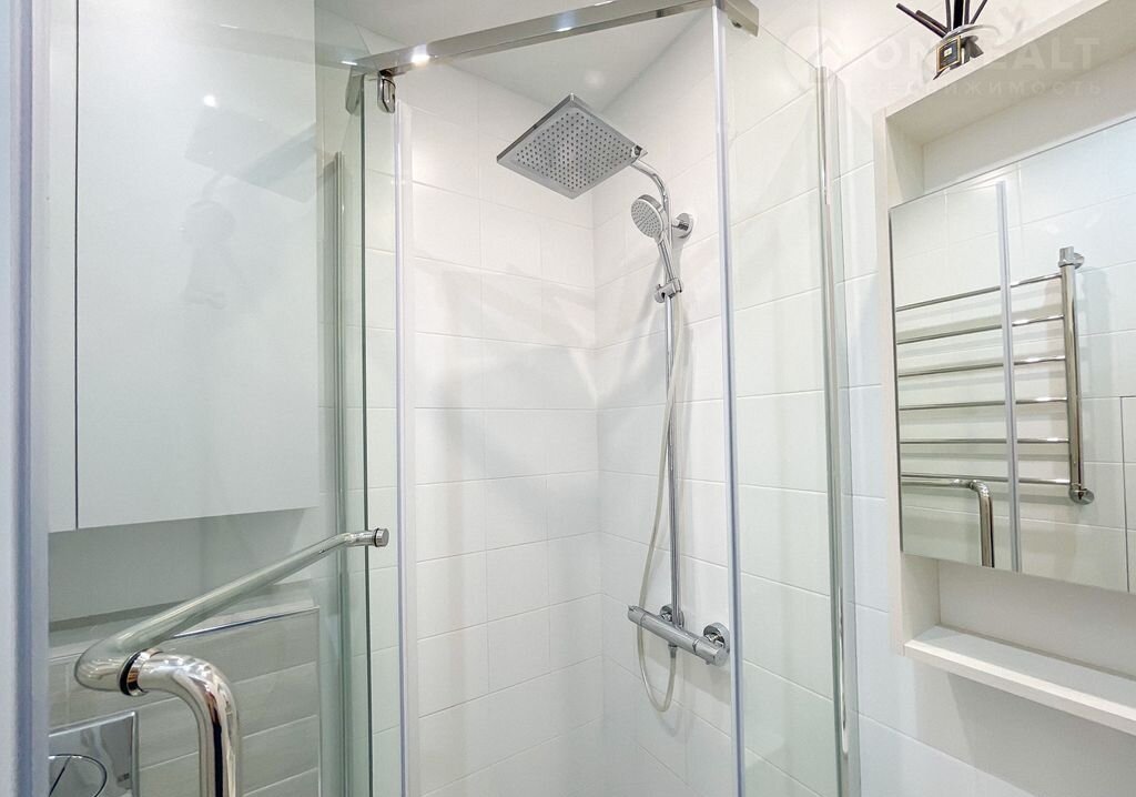 Совмещённый санузел выполнен в современном стиле. Встроенные тёплые полы обеспечивают дополнительный комфорт.