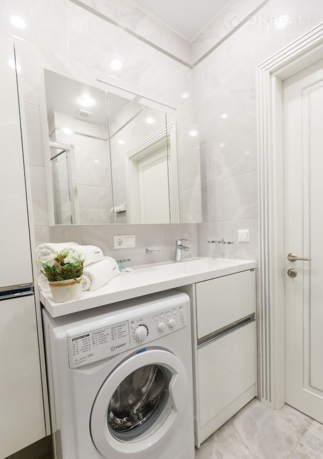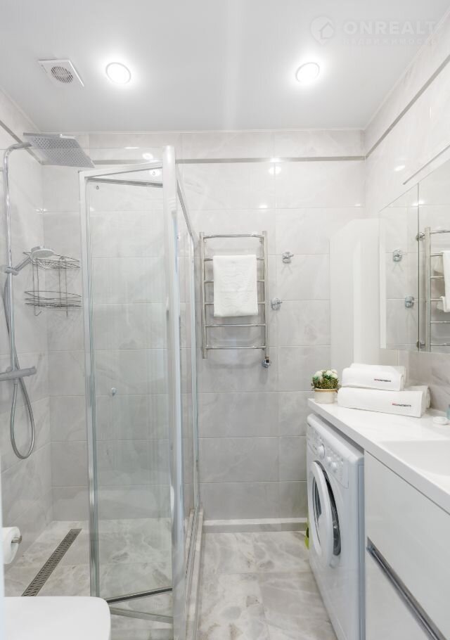 В ванной комнате находятся душевая кабина и стиральная машина, а тёплый пол добавляет комфорта.