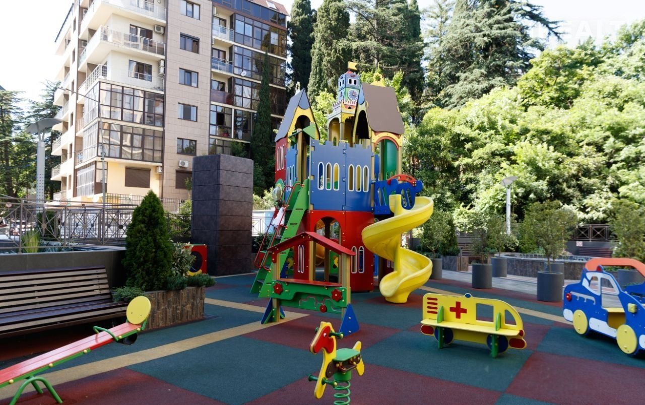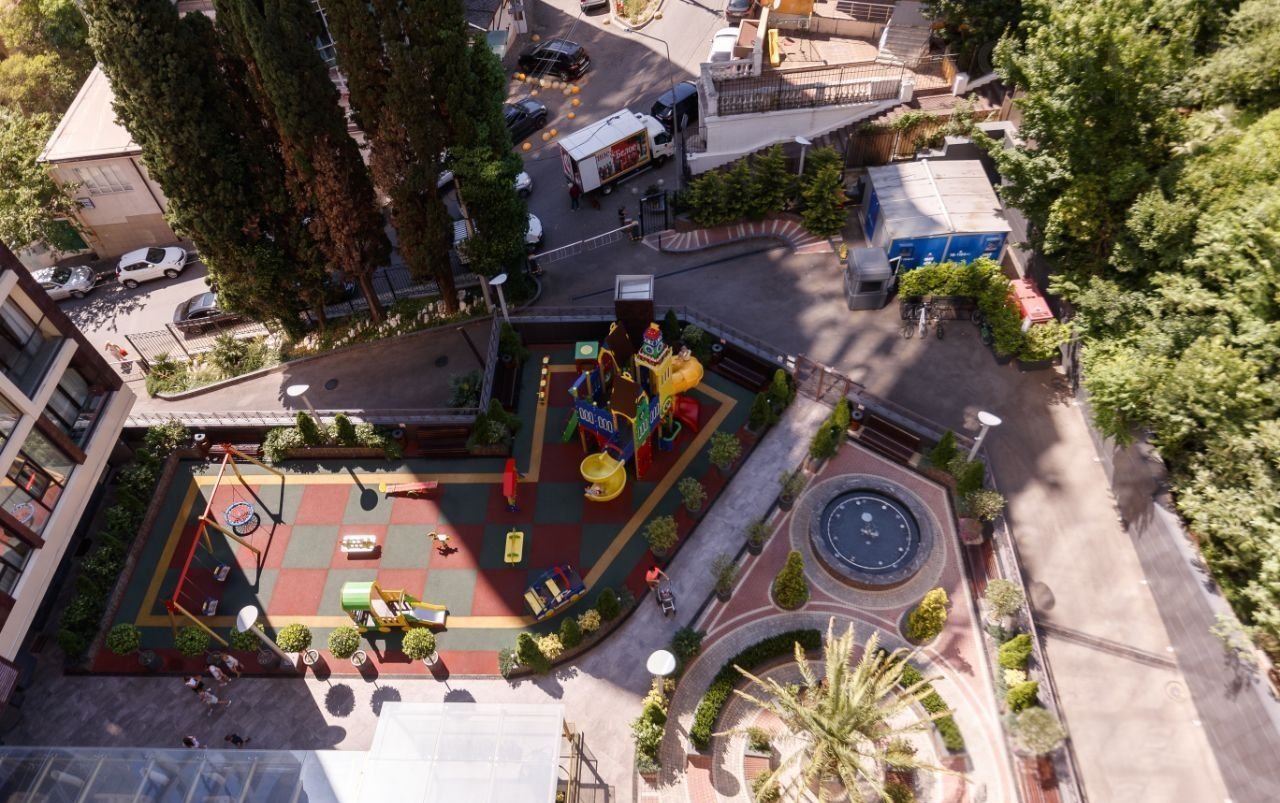 На территории комплекса предусмотрена детская площадка, а на крыше расположены бассейн, спортивные и игровые зоны, а также уютное пространство для отдыха на свежем воздухе.