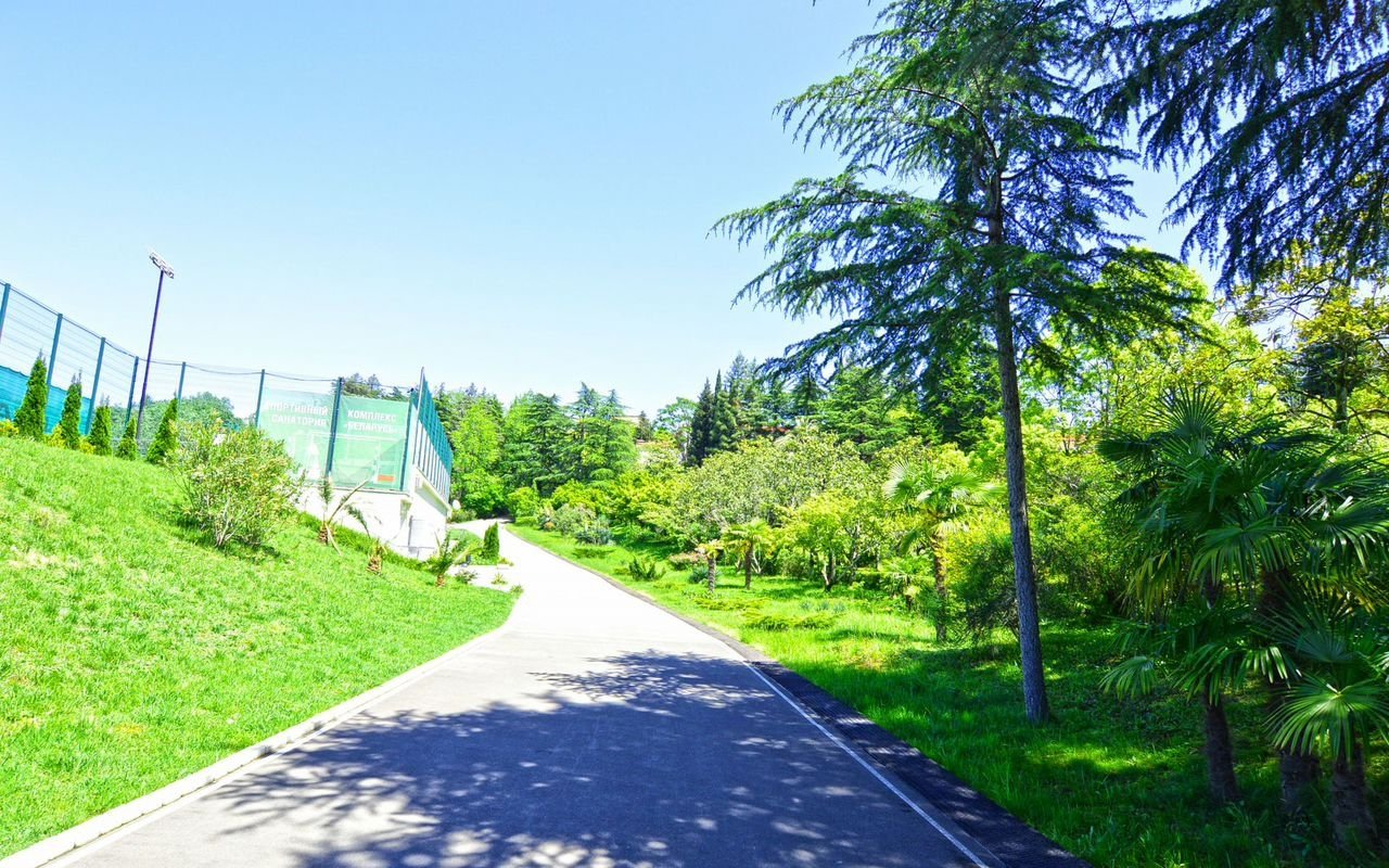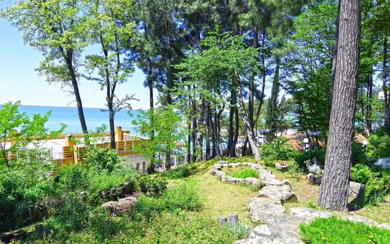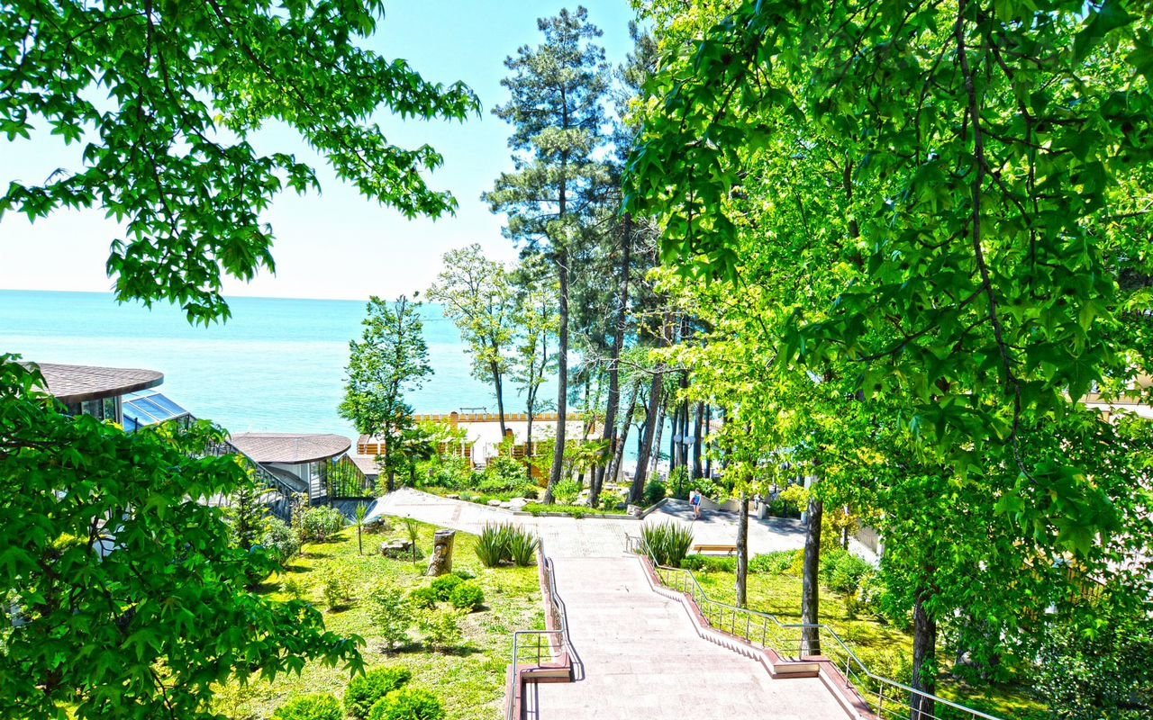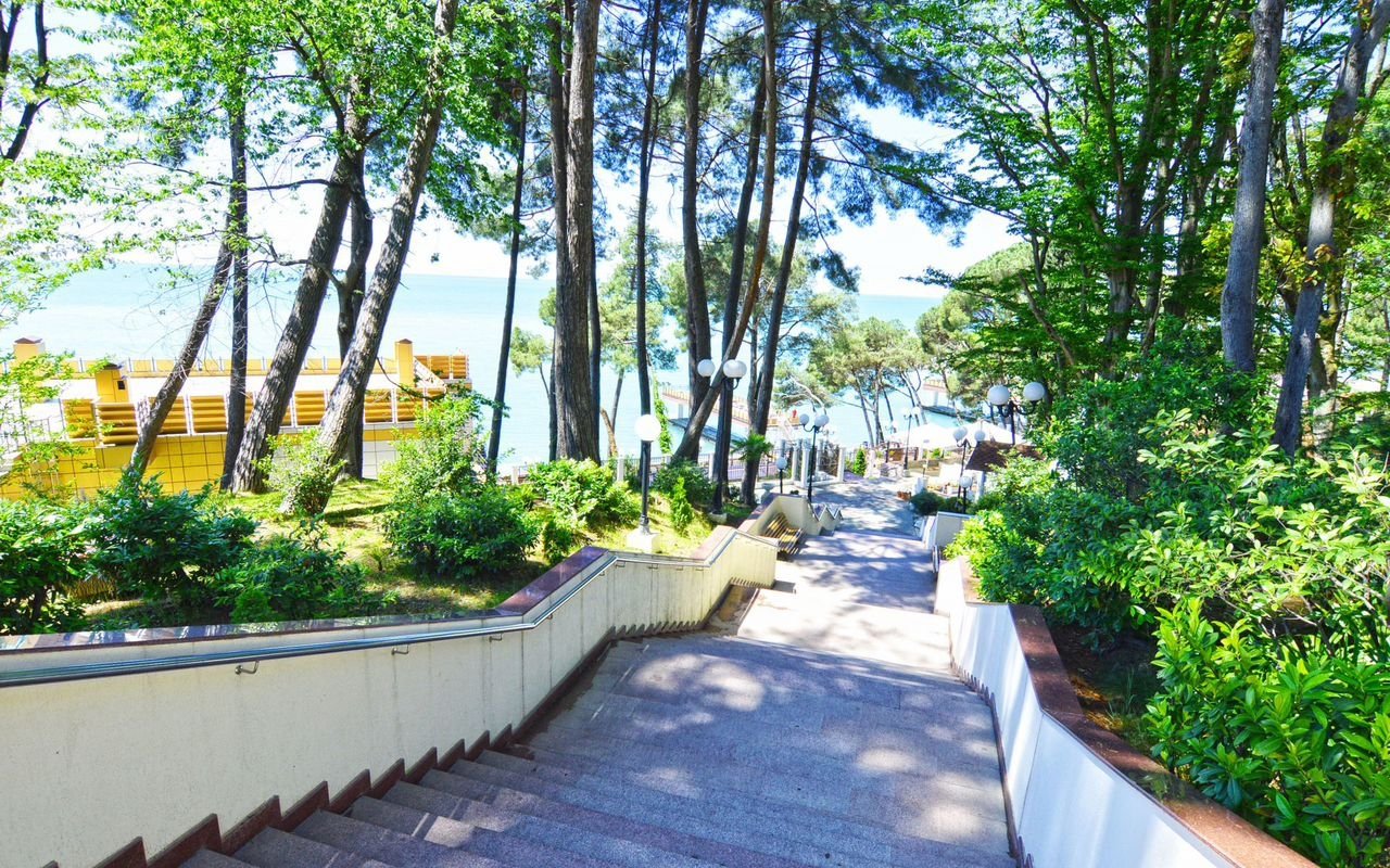 Территория Комплекса оформлена ландшафтным озеленением, детская площадка, большой бассейн с видом на море, открытая спортивная площадка, собственный охраняемый пляж, атак же на территории комплекса несколько ресторанов и кафе.