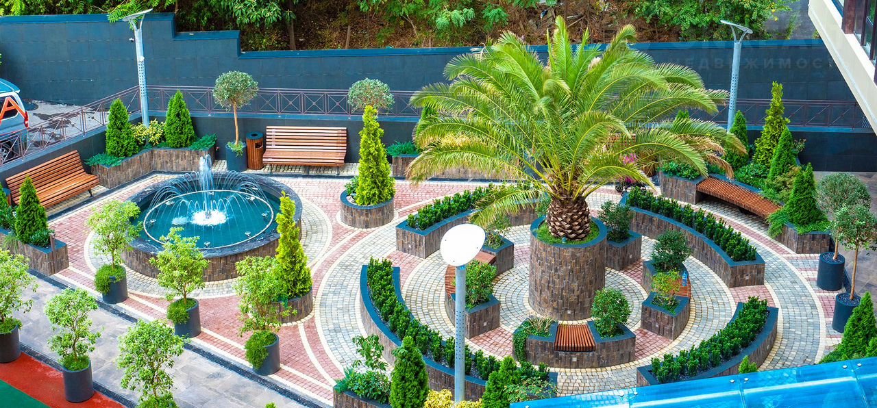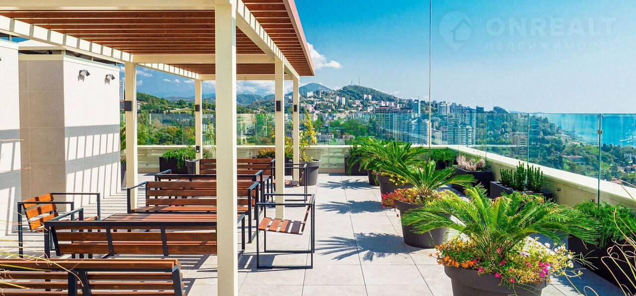 Особенностью комплекса является эксплуатируемая крыша с бассейном и панорамным видом на Сочи, море и горы.