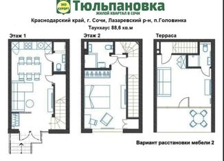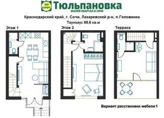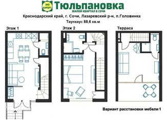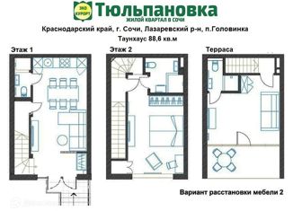 Застройщик! ЖК Тюльпановка в Сочи! 214 – ФЗ. Прекрасный поселок таунхаусов 100 метров от моря со всеми городскими коммуникациями. У каждого свое парковочное место. Таунхаус 88,6 м2 с потрясающей террасой с видом на пейзажи гор и на море. 1 этаж: прихожая, кухня-гостиная, с/у, кладовая. 2 этаж: спальня, ванная. 3 этаж: спальня с выходом на террасу, с/у. Территори... |