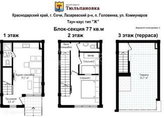 Застройщик! ЖК Тюльпановка в Сочи! 214 – ФЗ. Прекрасный поселок таунхаусов 100 метров от моря со всеми городскими коммуникациями. У каждого свое парковочное место. Таунхаус 88,1 м2 с потрясающей террасой с видом на пейзажи гор и на море. 1 этаж: прихожая, кухня-гостиная, с/у, кладовая. 2 этаж: спальня, ванная. 3 этаж: спальня с выходом на террасу, с/у. Территори... |