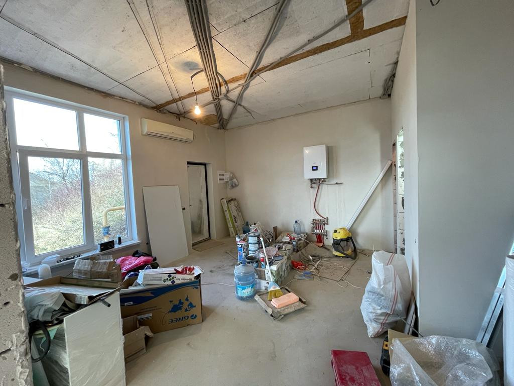Качественная чистовая отделка, разводка электрики, установлены сплит-системы, остается только поклеить обои и постелить напольное покрытие, монолитный качественно построенный дом .  На первом этаже зал и кухня гостиная, на втором этаже 3 спальни.