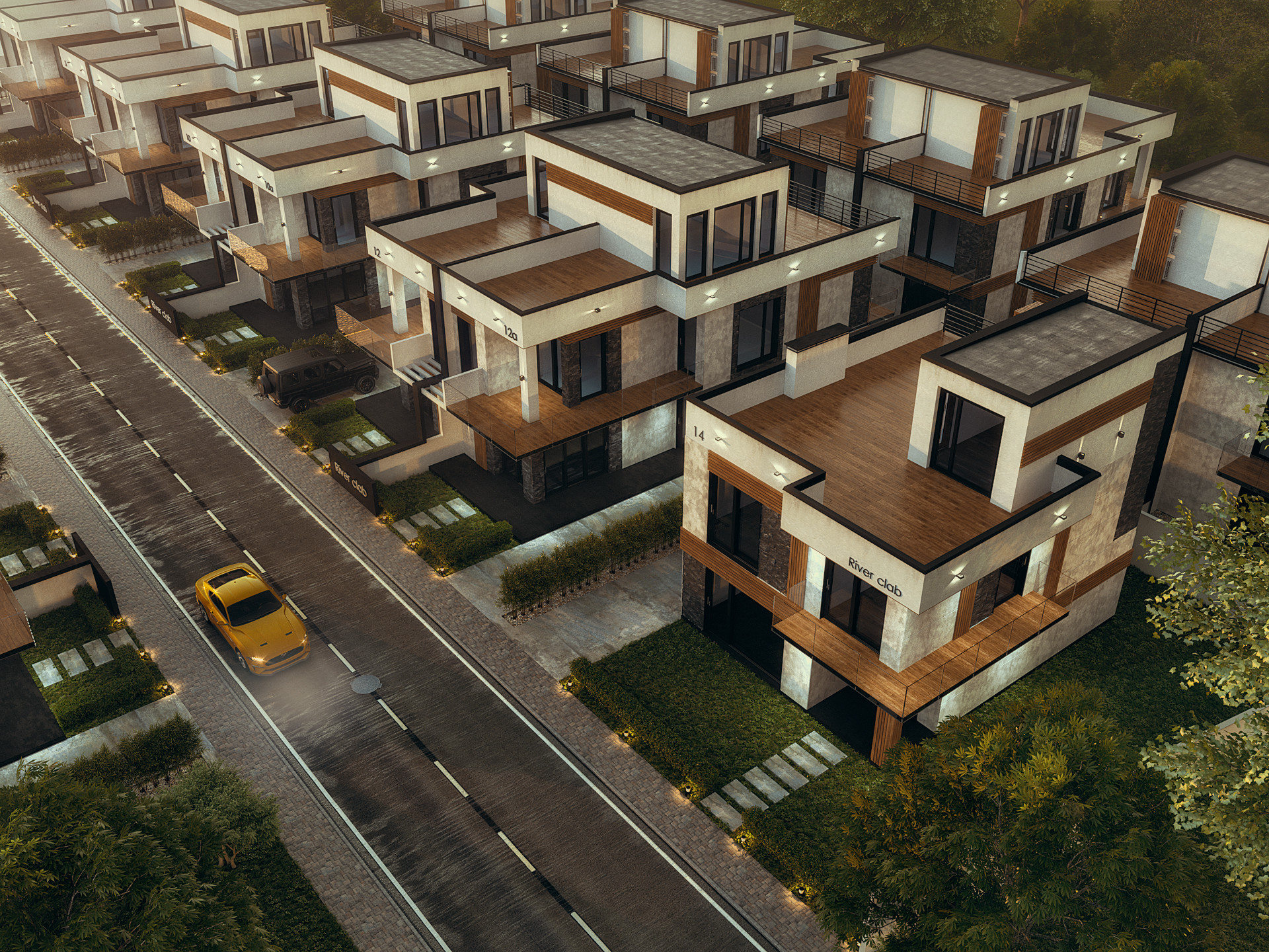 Посёлок представляет из себя комплекс коттеджей бизнес-класса, разделённых на дуплексы, к каждому из которых полагается 2 индивидуальных парковочных места. На крыше коттеджей оборудованы просторные террасы, идеальные для отдыха: можно загорать, встречать рассветы и провожать закаты, наслаждаясь красотой ландшафта, горным воздухом и премиальным комфортом. Во внешней отделке использованы качественные эко-материалы: ценные породы древесины и натуральный камень. Панорамные окна обеспечивают обильное естественное освещение.