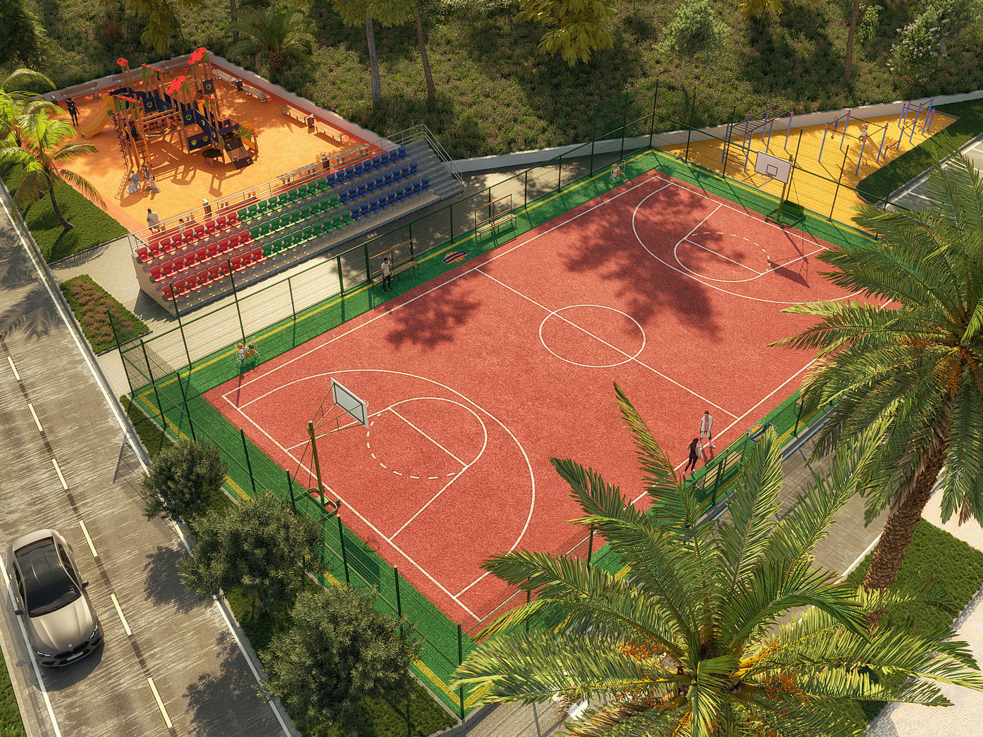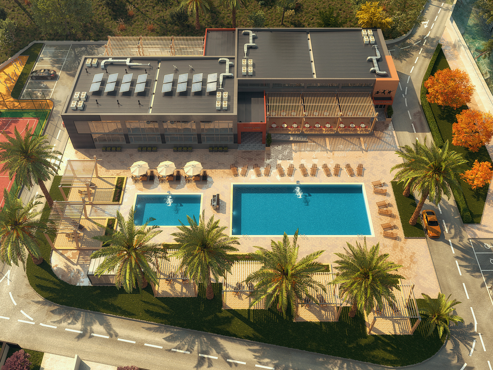 Посёлок благоустроен всем необходимым для приятного отдыха: зоны отдыха с прогулочными дорожками и беседками, продуманный ландшафтный дизайн с зелёными газонами и декоративными растениями, детская и спортивная площадки, футбольное поле, бассейн, батутный центр и ресторан.