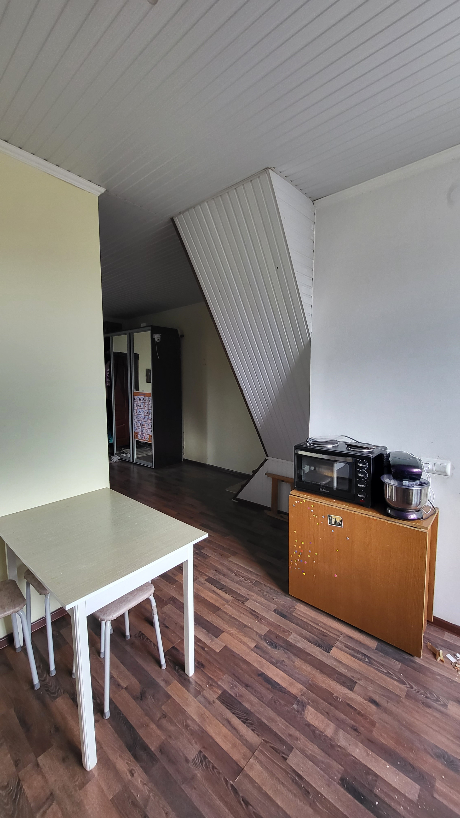 Первый этаж зонирован на гостиную и кухню. На втором этаже две комнаты. В цоколе — подсобное помещение.