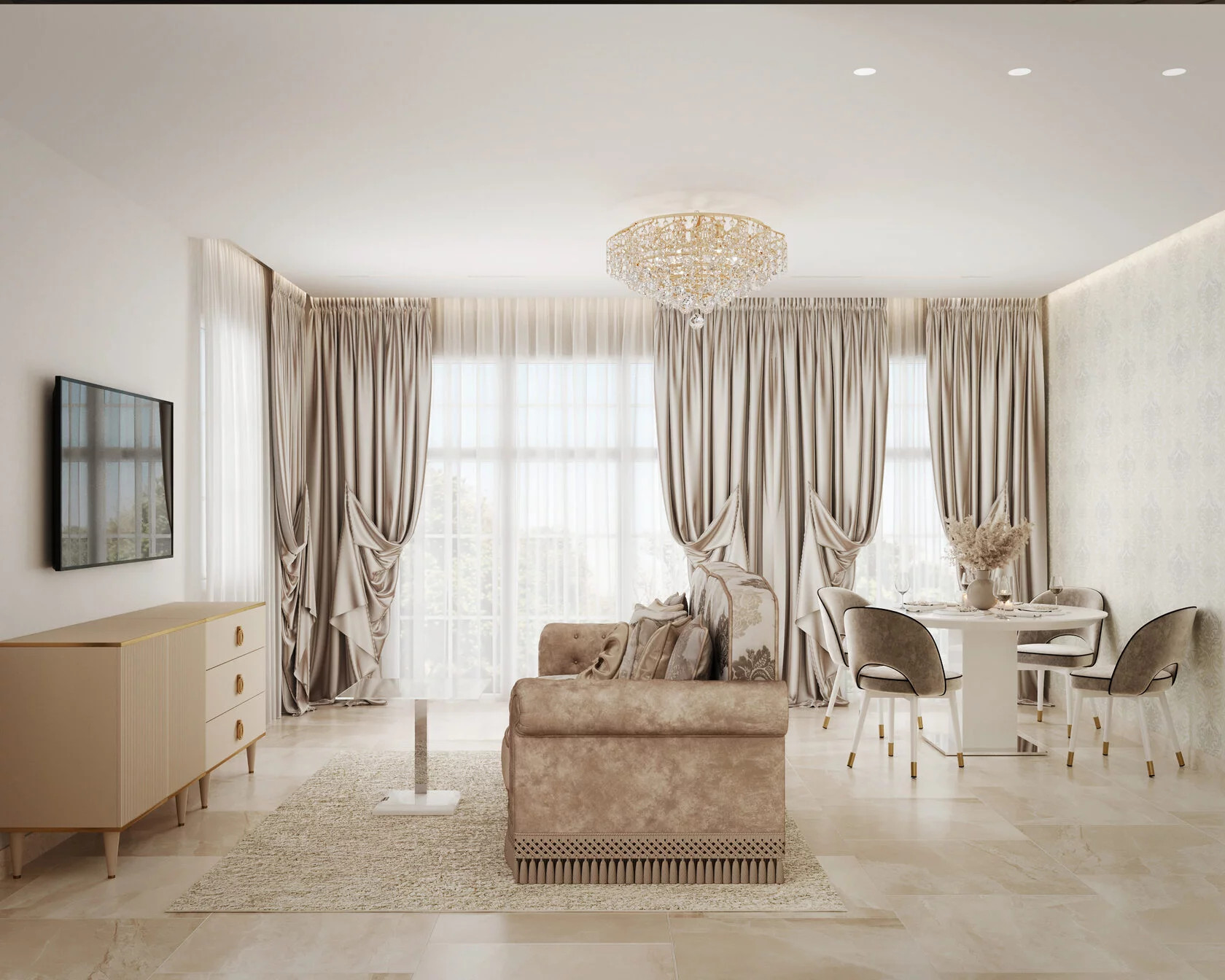 Площадь составляет 124 квадратных метров. Сделан высококачественный дизайнерский ремонт с использованием премиальных материалов.