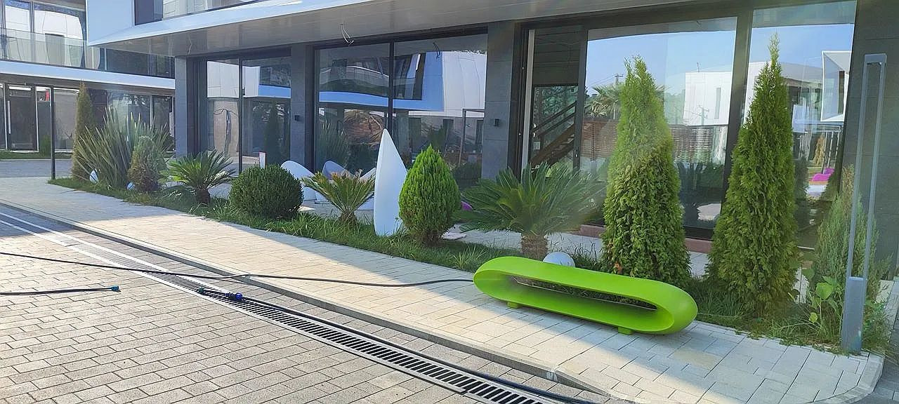 Теpритория с лaндшaфтным дизайном и озеленением, живая изгородь, авто-полив.