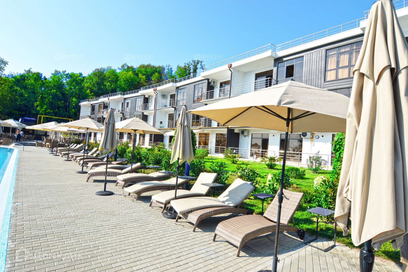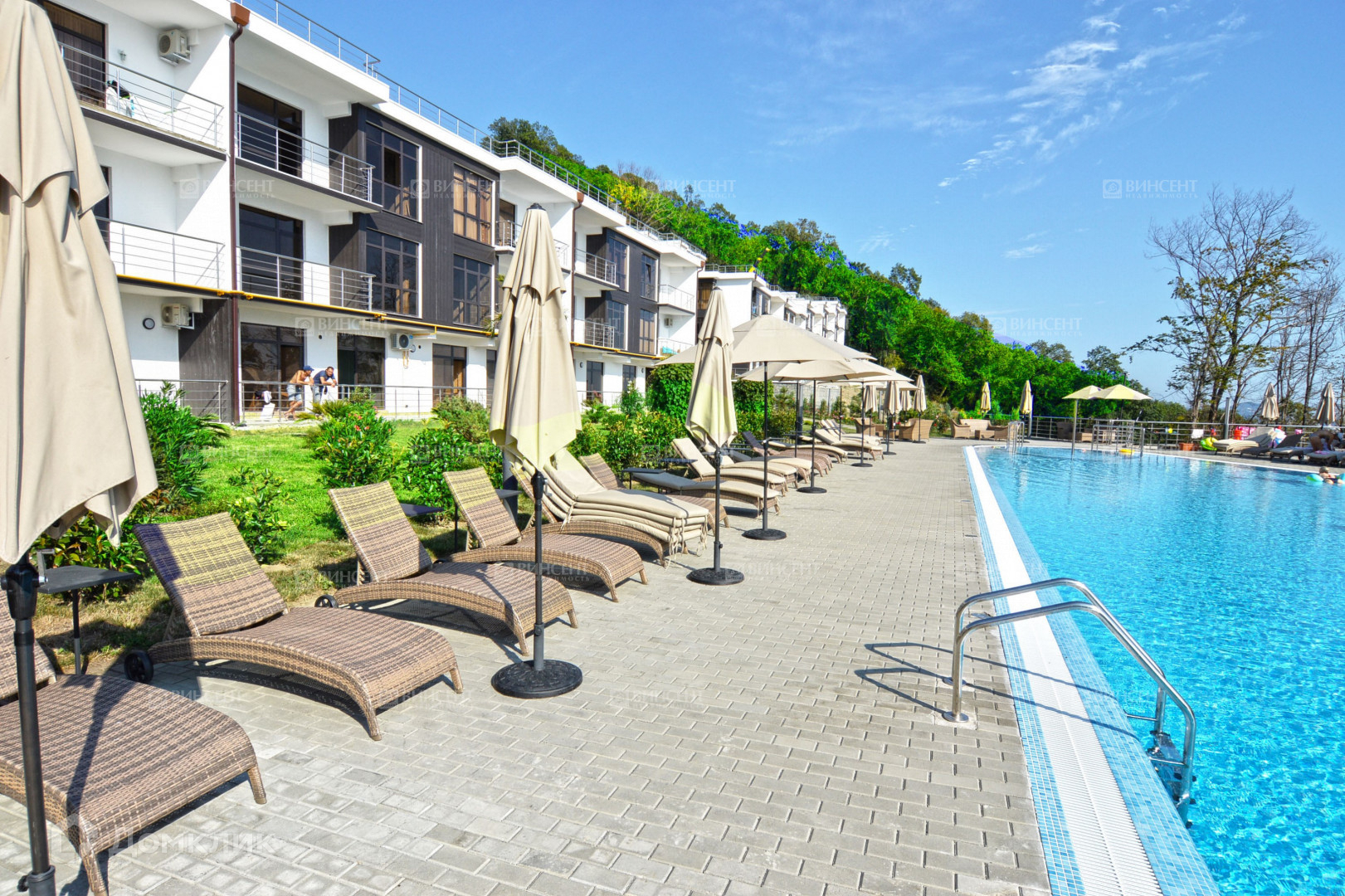 Территория Комплекса оформлена ландшафтным озеленением, большой бассейн с видом на море, тренажёрный зал, несколько теннисных площадок, детские площадки, парковка и несколько престижных ресторанов.